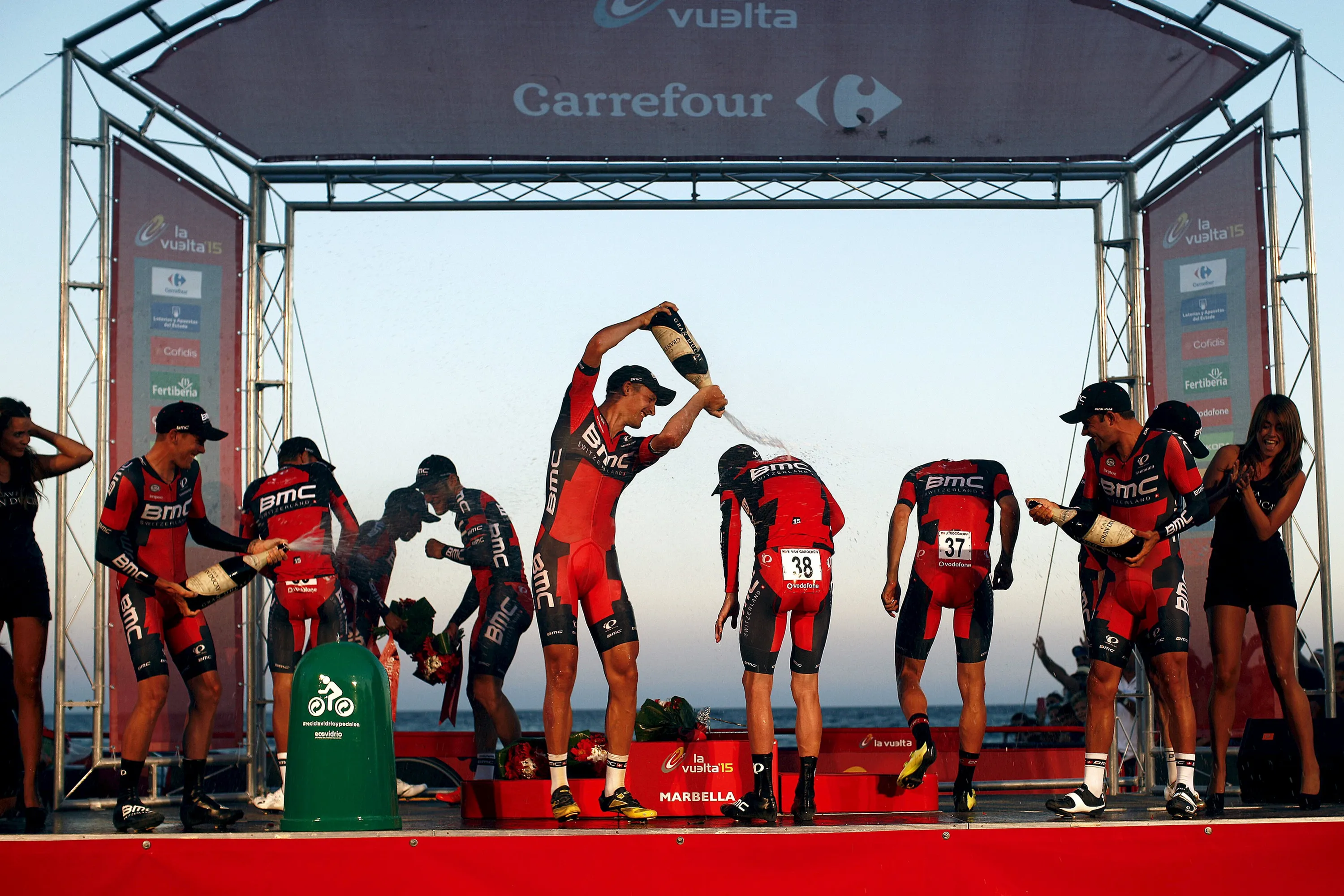 BMC Racing Team riders spray champagne after winning the 7.4 km (4.6 miles) team time trial in the first stage of the Vuelta Tour of Spain cycling race from Puerto Banus to Marbella, in Marbella, southern Spain, August 22, 2015. (Photo by Jon Nazca/Reuters)