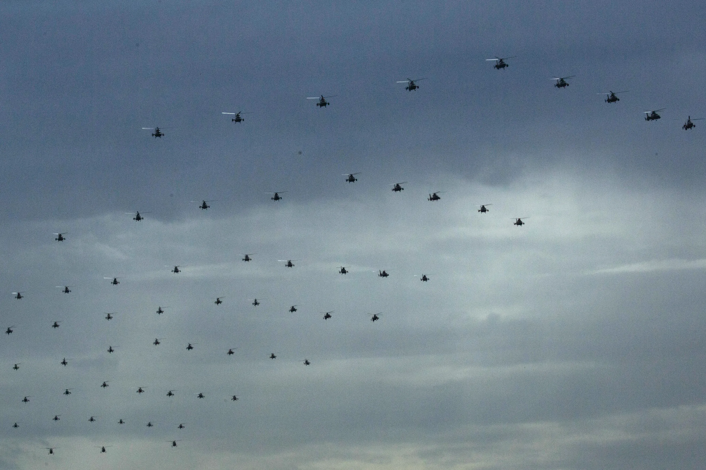 Chinese military helicopters take part in rehearsals ahead of the Sept. 3 military parade to commemorate the end of World War II in Beijing, Sunday, August 23, 2015. (Photo by Ng Han Guan/AP Photo)
