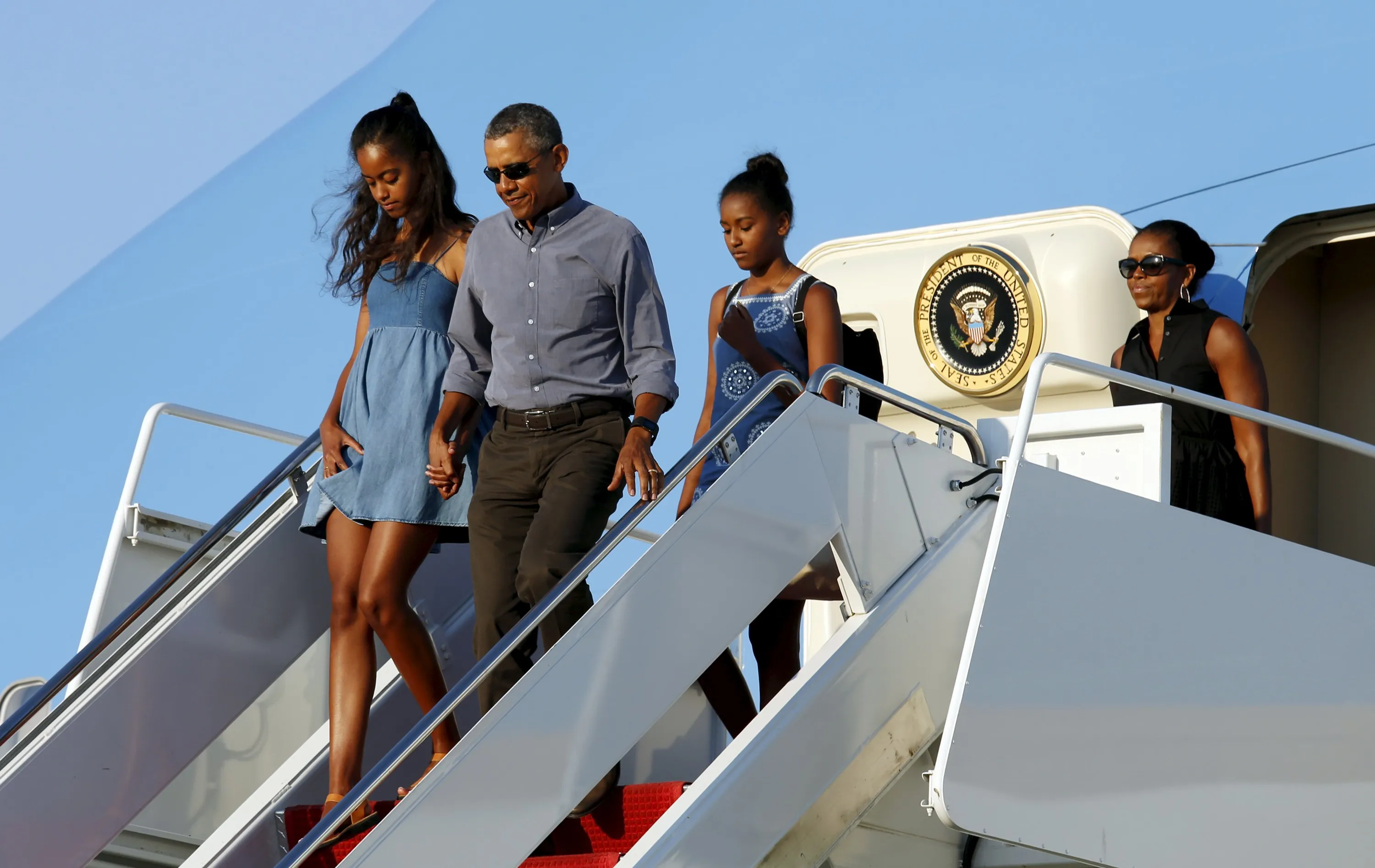 U.S. President Barack Obama holds hands with his daughter Malia as the Obama family disembark Air Force One upon their return to Washington after a two-week vacation on Martha's Vineyard August 23, 2015. (Photo by Kevin Lamarque/Reuters)