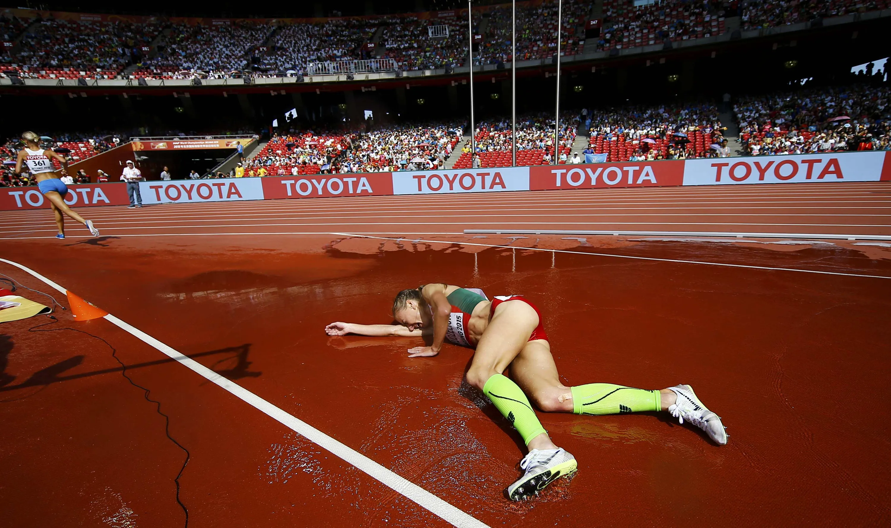 Sviatlana Kudzelich of Belarus falls in the women's 3,000 metres steeplechase heat during the 15th IAAF World Championships at the National Stadium in Beijing, China August 24, 2015. (Photo by Kai Pfaffenbach/Reuters)