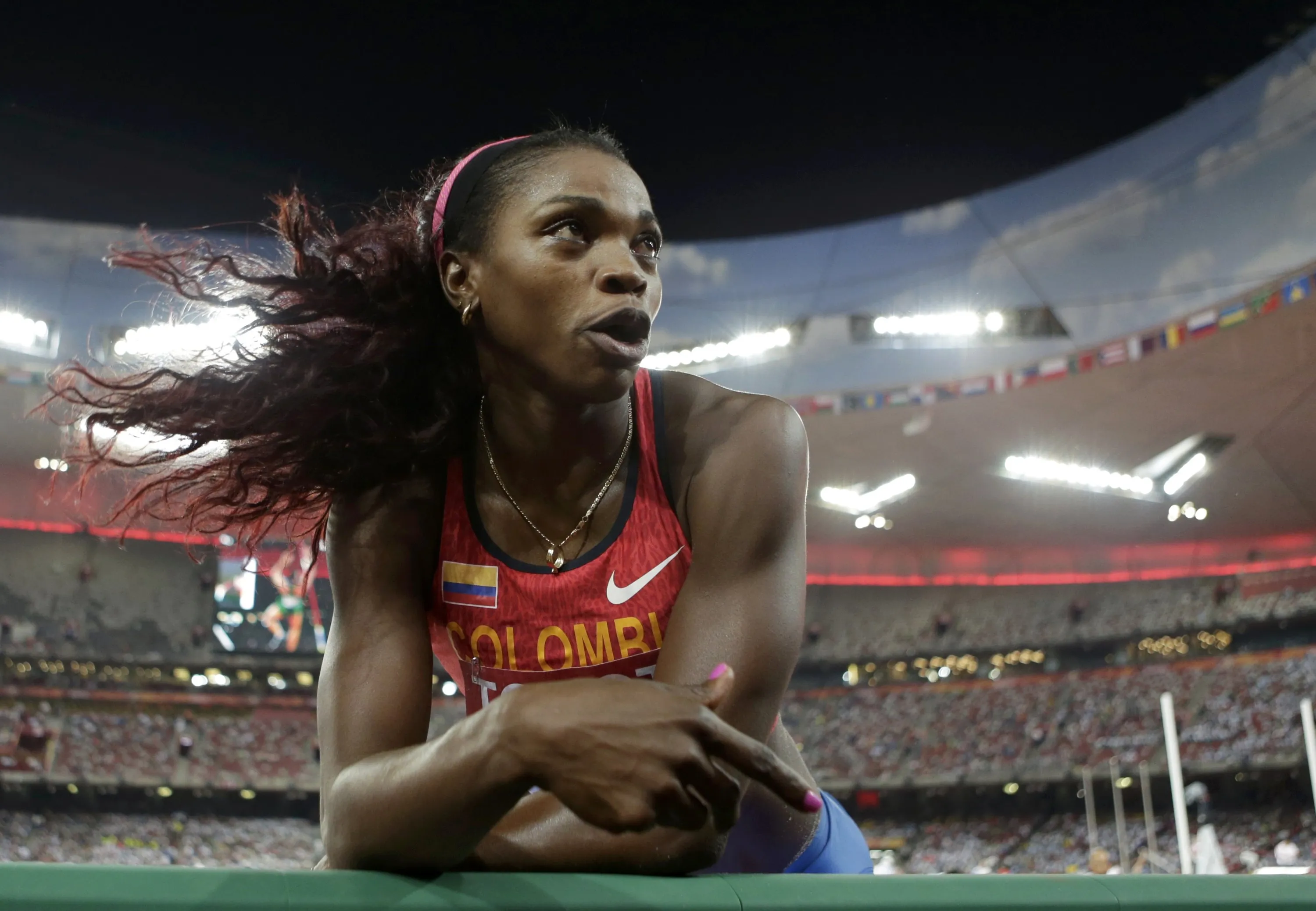 Caterine Ibarguen of Colombia speaks to her coach as she competes in the women's triple jump final during the 15th IAAF World Championships at the National Stadium in Beijing, China, August 24, 2015. (Photo by Jason Lee/Reuters)