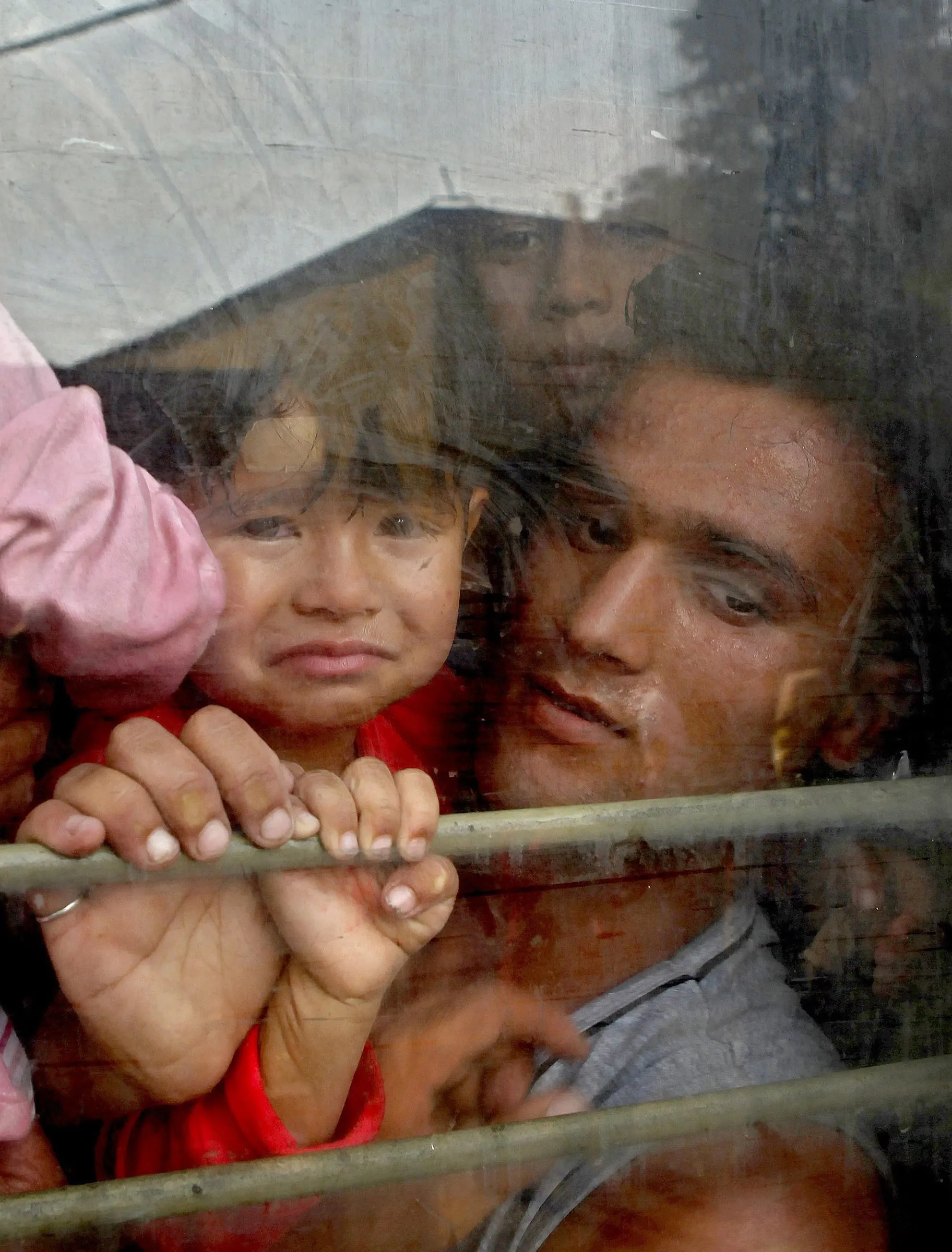 Migrants look out of a window onboard a crowded train taking them towards Serbia, at the railway station in the southern Macedonian town of Gevgelija, on Sunday, August 16, 2015. (Photo by Boris Grdanoski/AP Photo)