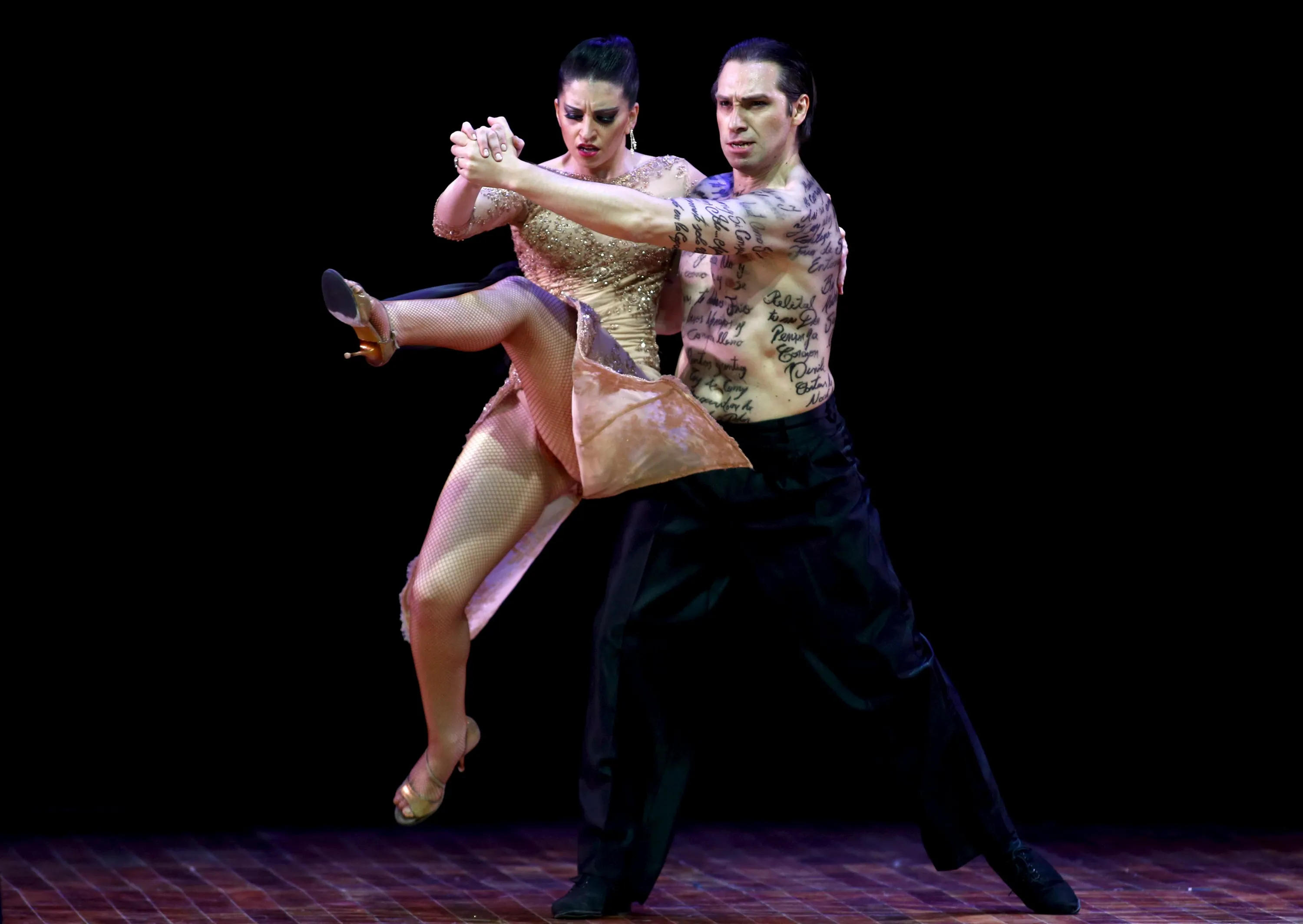 Hugo Mastrolorenzo (R) and Diana Pujol from Argentina, who are representing the city of Los Polvorines, dance during the Stage style final round at the Tango World Championship in Buenos Aires, Argentina, August 27, 2015. (Photo by Marcos Brindicci/Reuters)