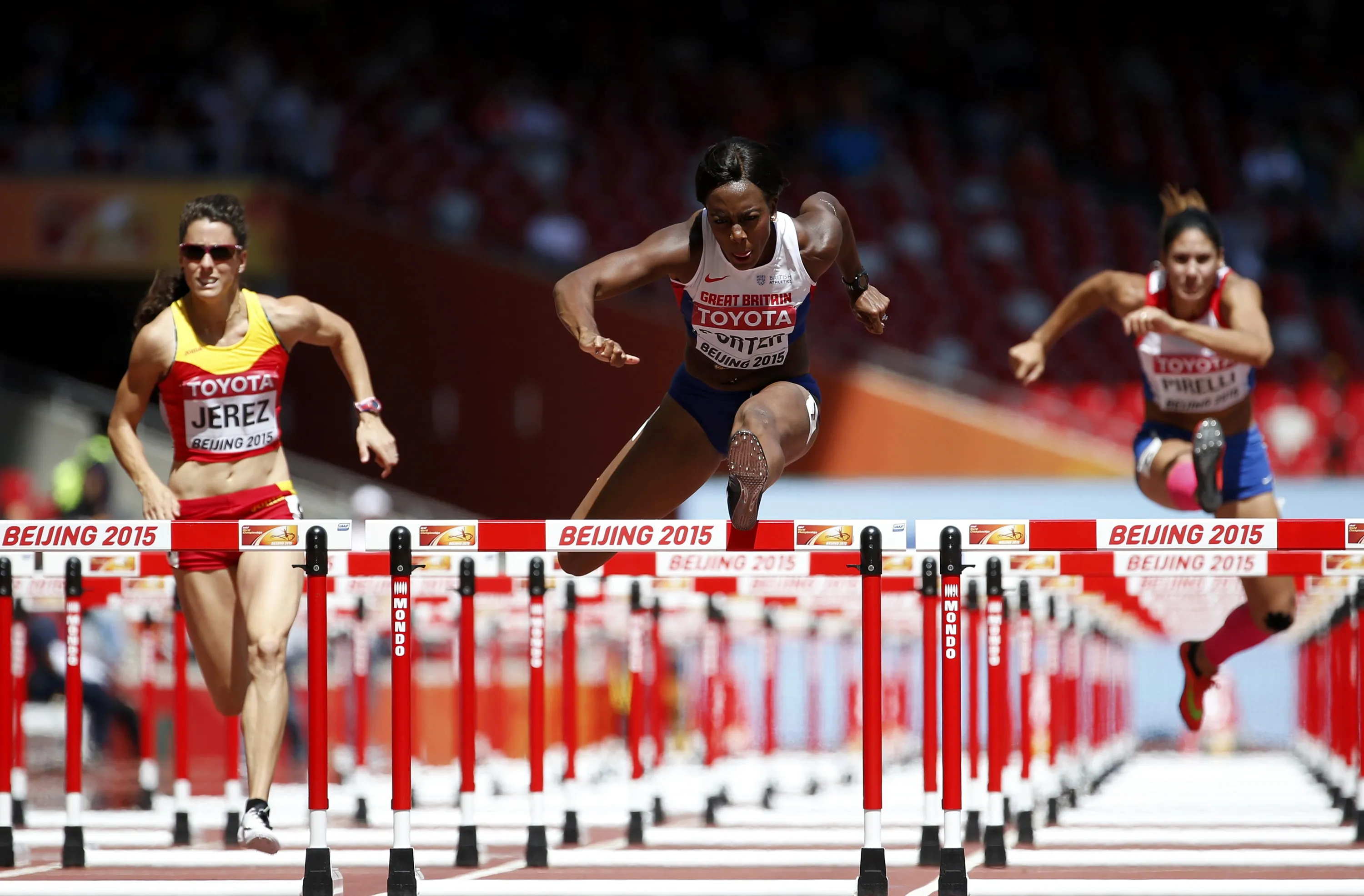 Tiffany Porter of Britain (C) competes in the women's 100 metres hurdles heats during the 15th IAAF World Championships at the National Stadium in Beijing, China August 27, 2015. (Photo by Lucy Nicholson/Reuters)