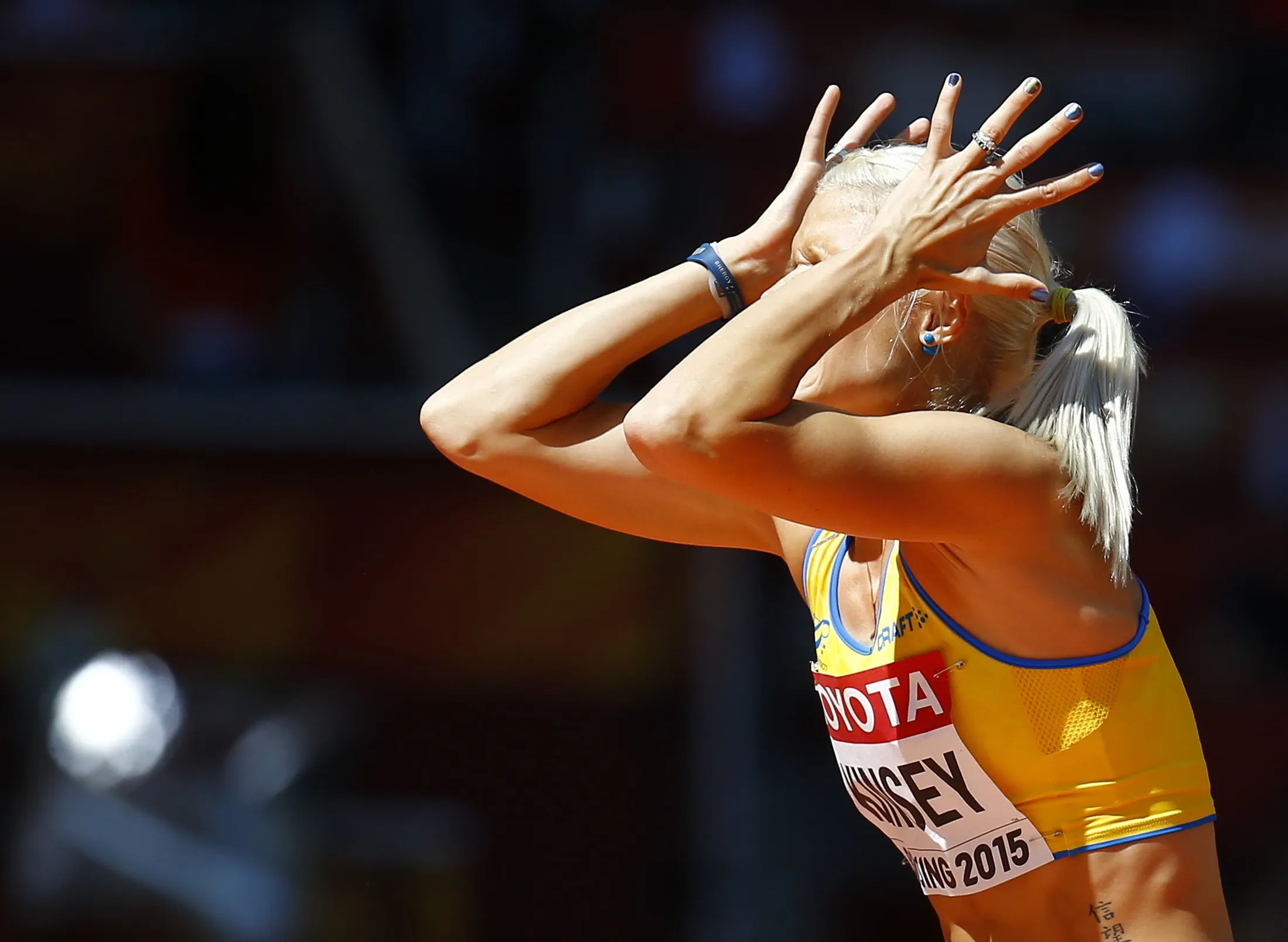 Erika Kinsey of Sweden reacts during the women's high jump qualification event at the 15th IAAF World Championships at the National Stadium in Beijing, China, August 27, 2015. (Photo by Kai Pfaffenbach/Reuters)