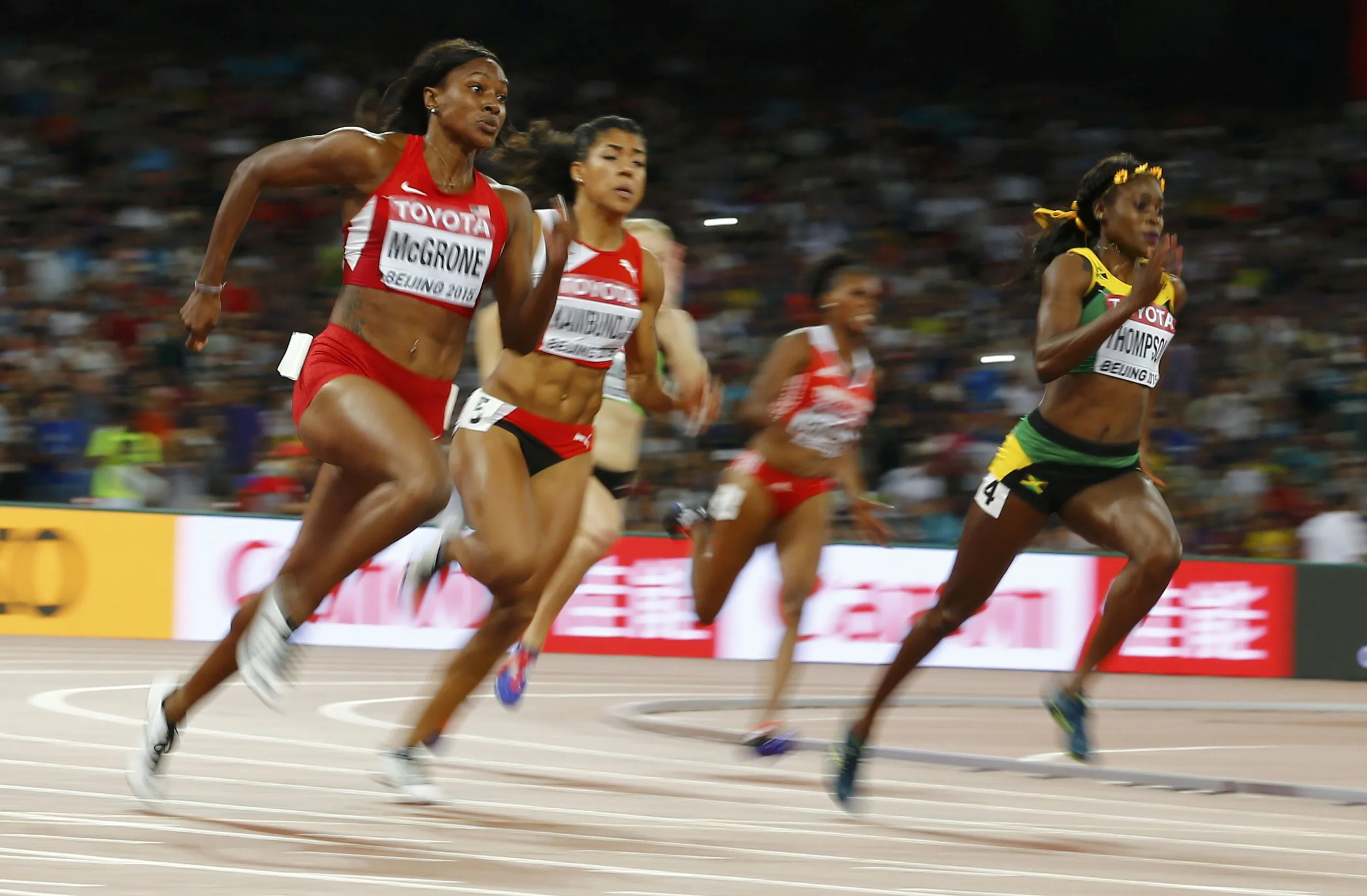 Elaine Thompson of Jamaica (R), Candyce McGrone of U.S. (L) compete in the women's 200 metres semi-final during the 15th IAAF World Championships at the National Stadium in Beijing, China August 27, 2015. (Photo by Damir Sagolj/Reuters)