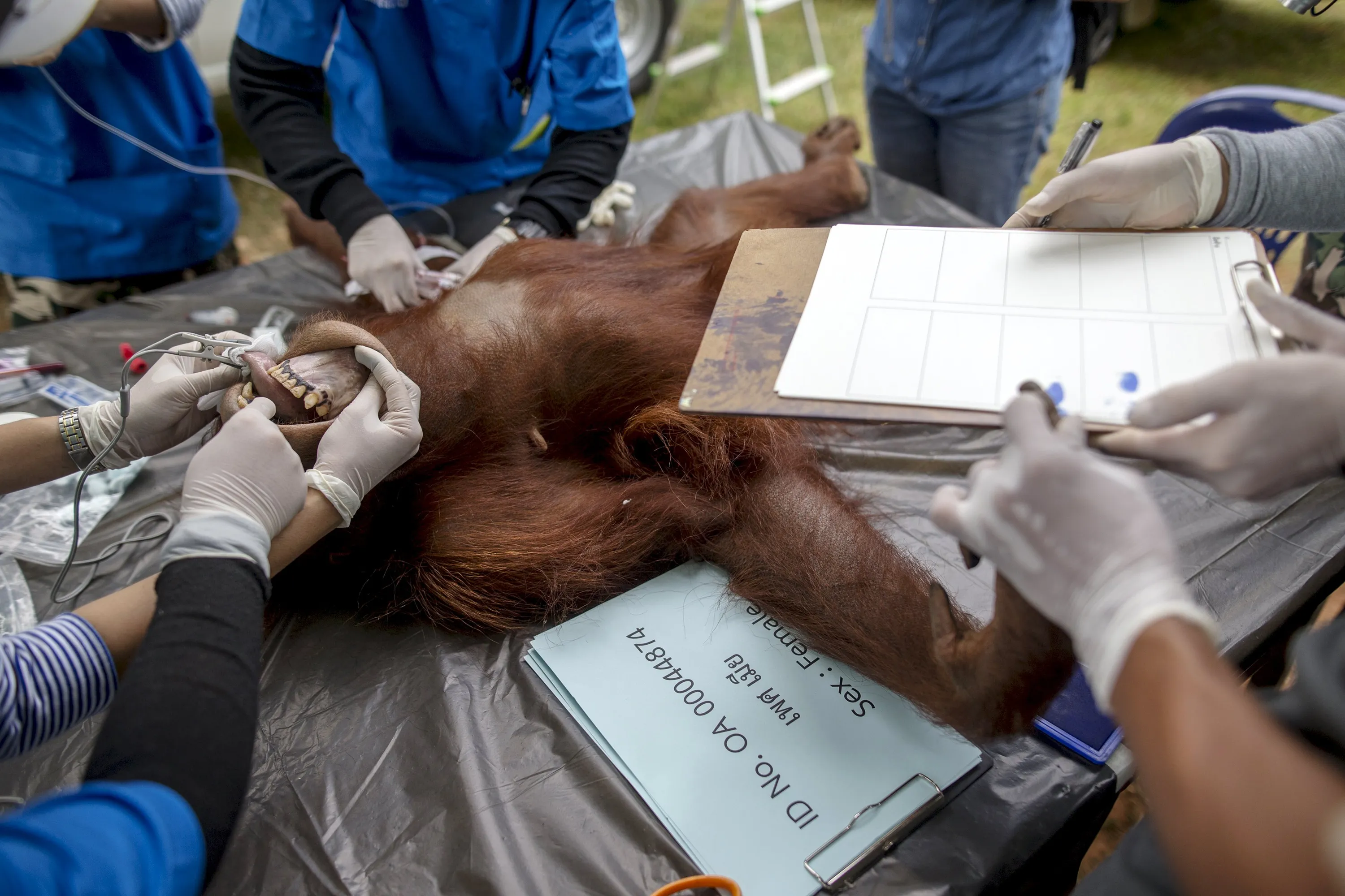 Thai veterinarians collect the fingerprints of an orangutan during a health examination at Kao Pratubchang Conservation Centre in Ratchaburi, Thailand, August 27, 2015. (Photo by Athit Perawongmetha/Reuters)
