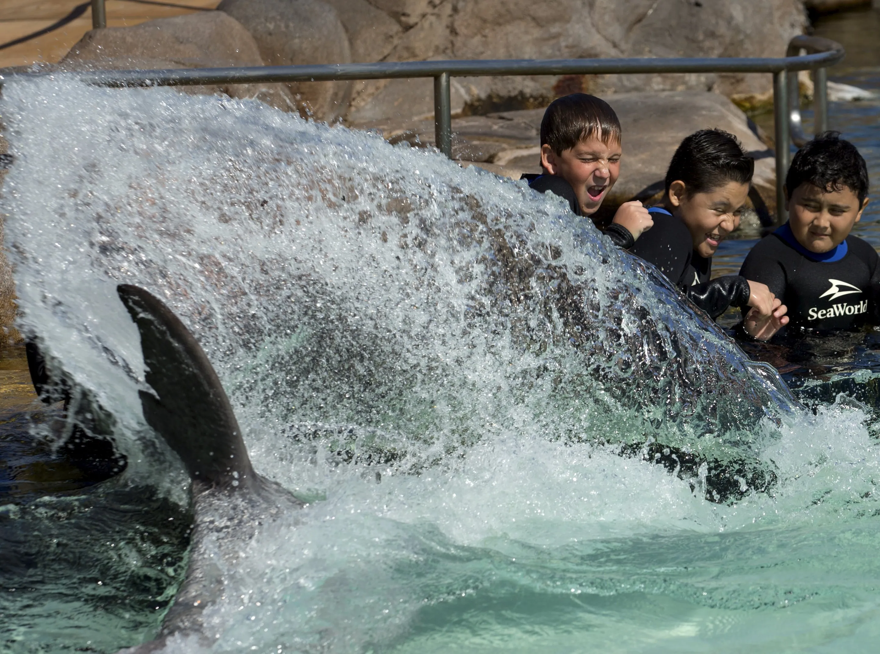 Patients from Rady Children's Hospital are sprayed with water by a bottlenose dolphin after being invited to swim and interact with dolphins at Sea World in San Diego, California August 27, 2015. (Photo by Mike Blake/Reuters)
