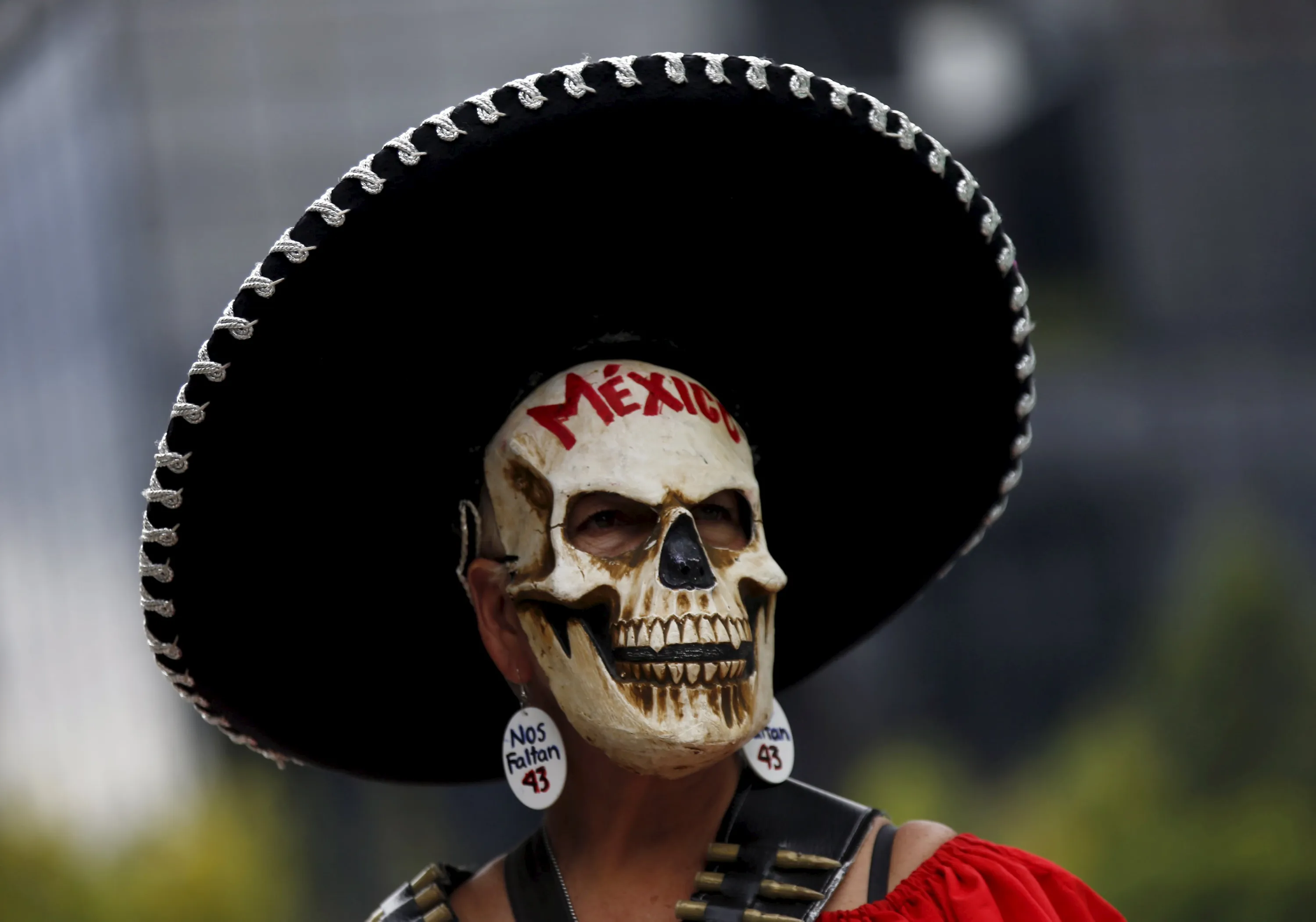 A demonstrator wearing a skull mask takes part in a protest to mark the eleven-month anniversary of their disappearance in Mexico City, Mexico August 26, 2015. The students' disappearance on the night of September 26, 2014 in the southwestern city of Iguala triggered massive protests in Mexico and calls for justice. Officials say they were abducted by corrupt police officers, who handed them over to a local drug gang. The words the earring read: “We are missing 43”. (Photo by Henry Romero/Reuters)