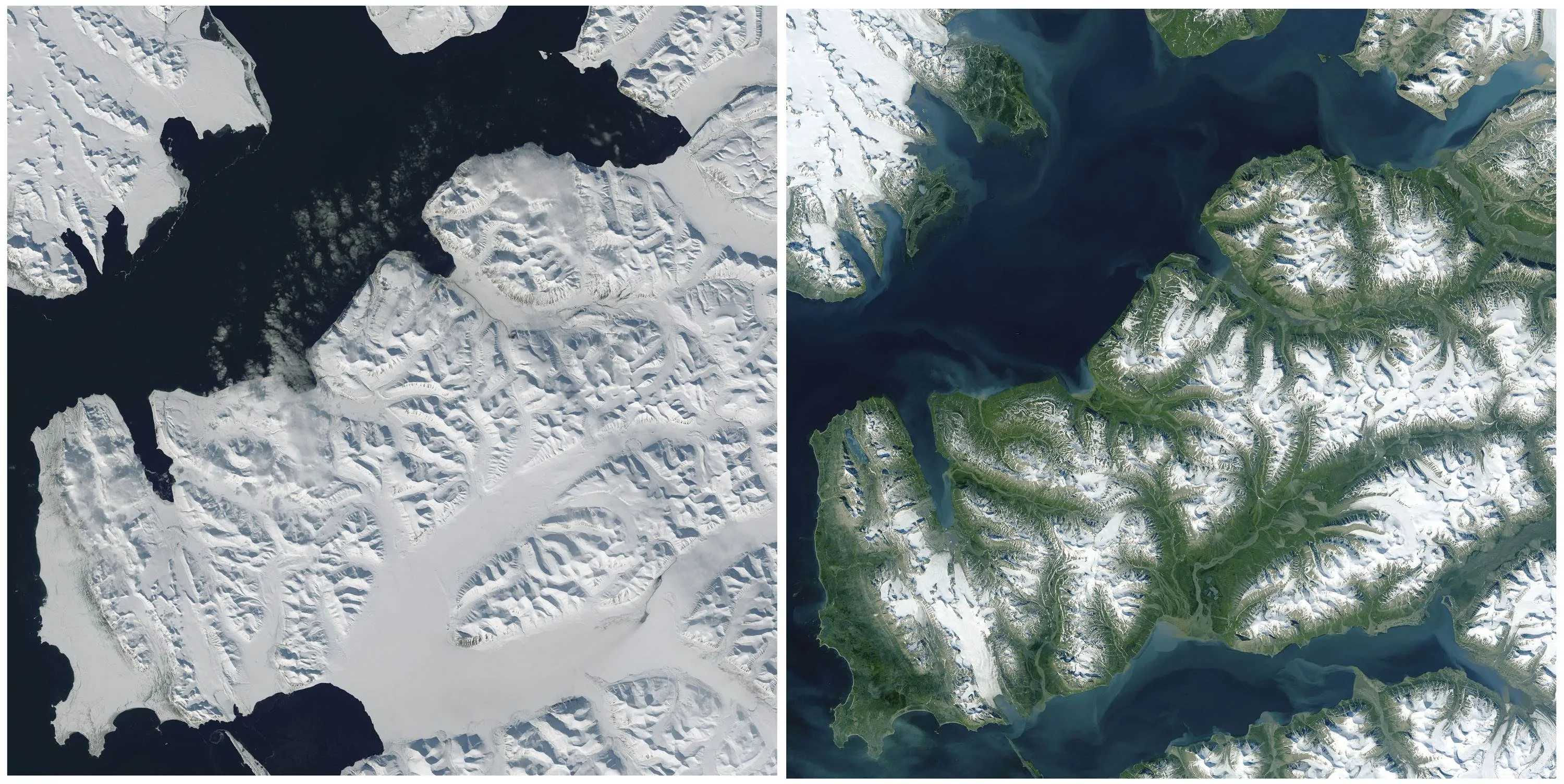 The Reindalen Valley in the Norwegian archipelago of Svalbard is seen in a combination of NASA images acquired by the Operational Land Imager on the Landsat 8 satellite on April 29 (L) and July 9, 2015 and released August 27, 2015. Despite its northerly location 1,300 kilometers (800 miles) from the North Pole, the West Spitsbergen Current brings a relatively warm stream of water from the south into the fjords and inlets of western Svalbard. This warm water moderates the climate enough that coastal areas and certain valleys witness an explosion of green in the summer. (Photo by Reuters/NASA)