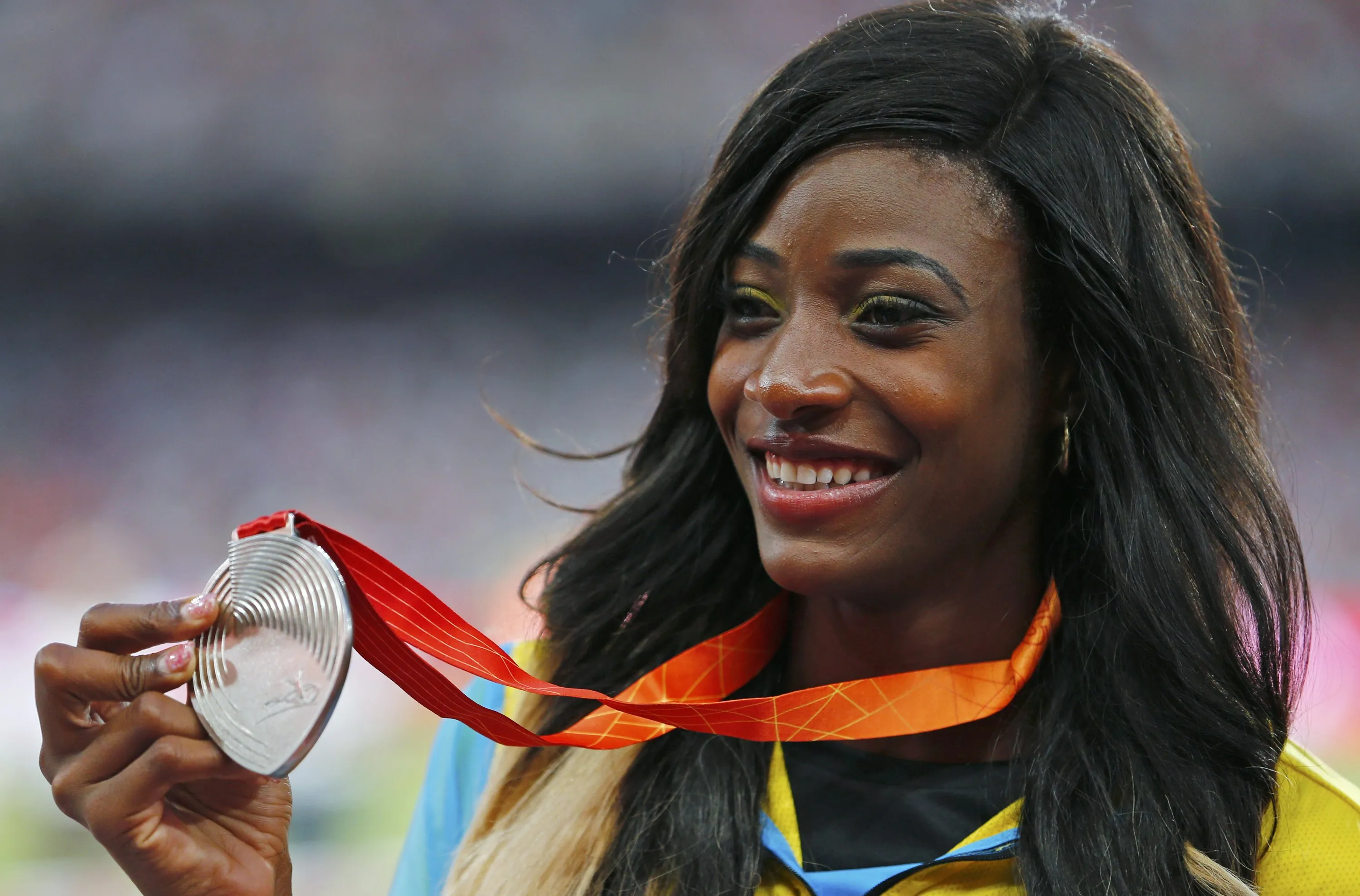 Shaunae Miller of Bahamas presents her silver medal as she poses on the podium after the women's 400m event during the 15th IAAF World Championships at the National Stadium in Beijing, China, August 28, 2015. (Photo by Damir Sagolj/Reuters)