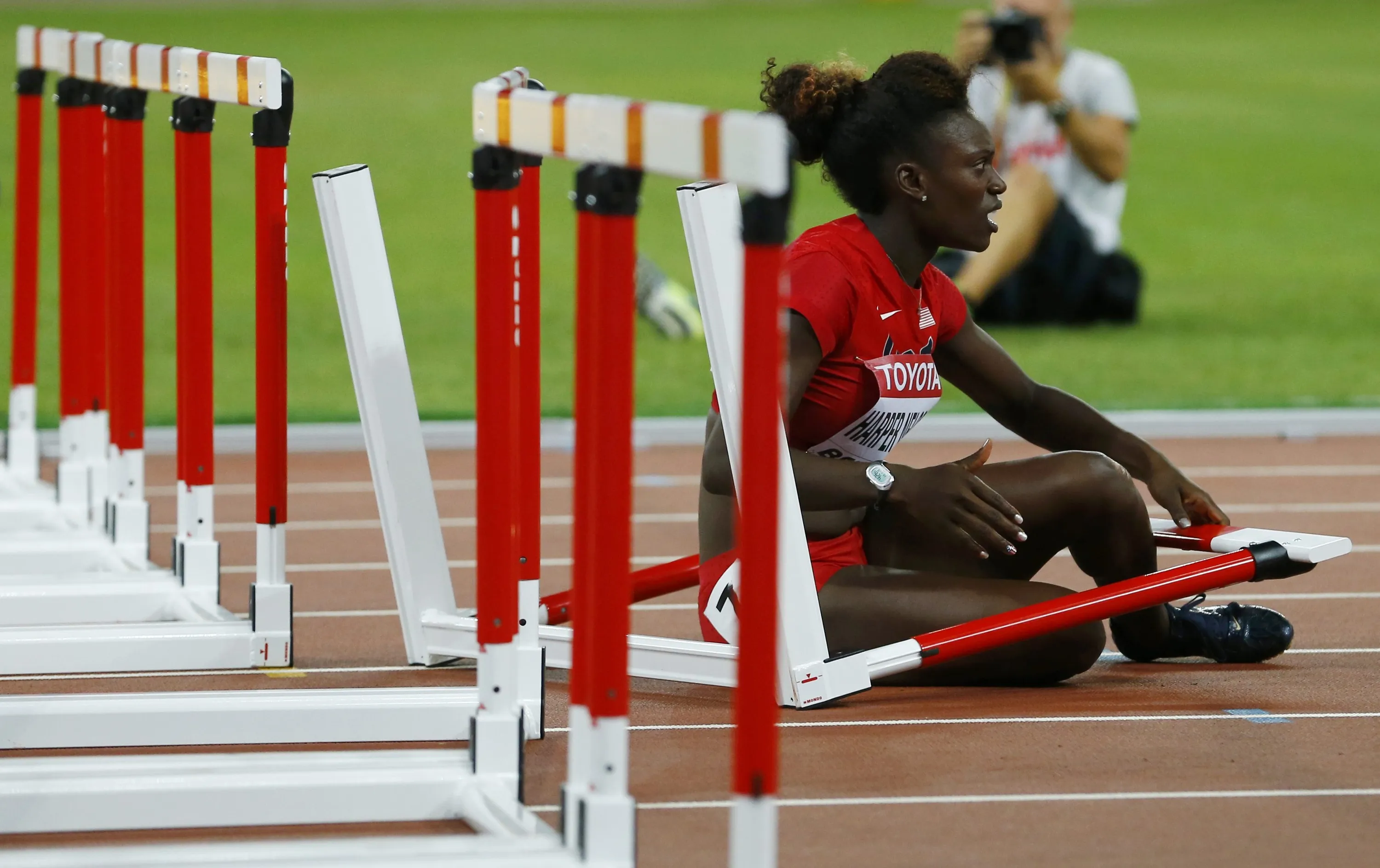 Dawn Harper Nelson of U.S. crashes into a hurdle in the women's 100 metres hurdles semi-final during the 15th IAAF World Championships at the National Stadium in Beijing, China August 28, 2015. (Photo by Damir Sagolj/Reuters)