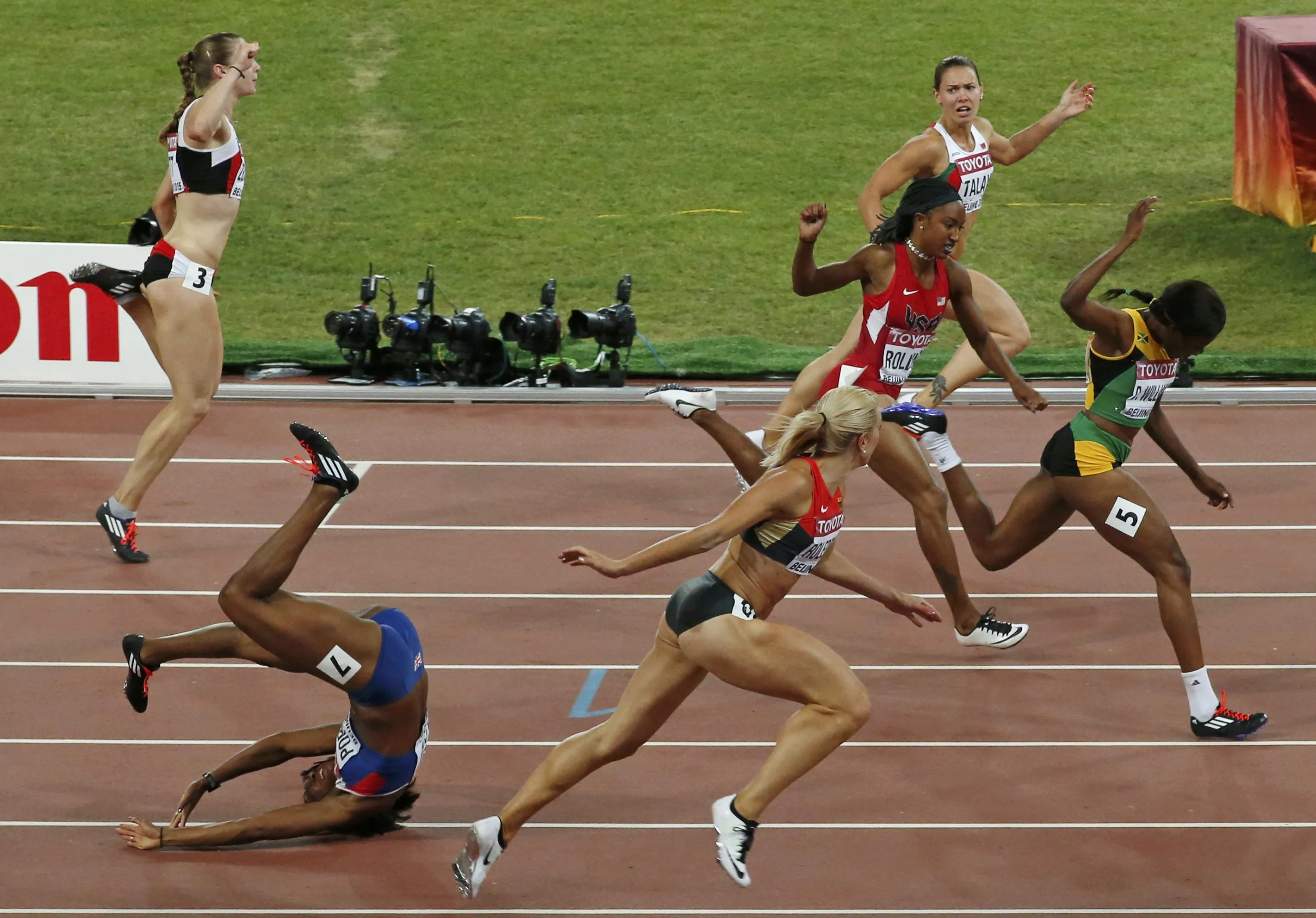 Tiffany Porter of Britain falls (2ndL) next to Cindy Roleder of Germany (C front) after competing in the women's 100 metres hurdles final during the 15th IAAF World Championships at the National Stadium in Beijing, China, August 28, 2015. (Photo by Kim Kyung-Hoon/Reuters)