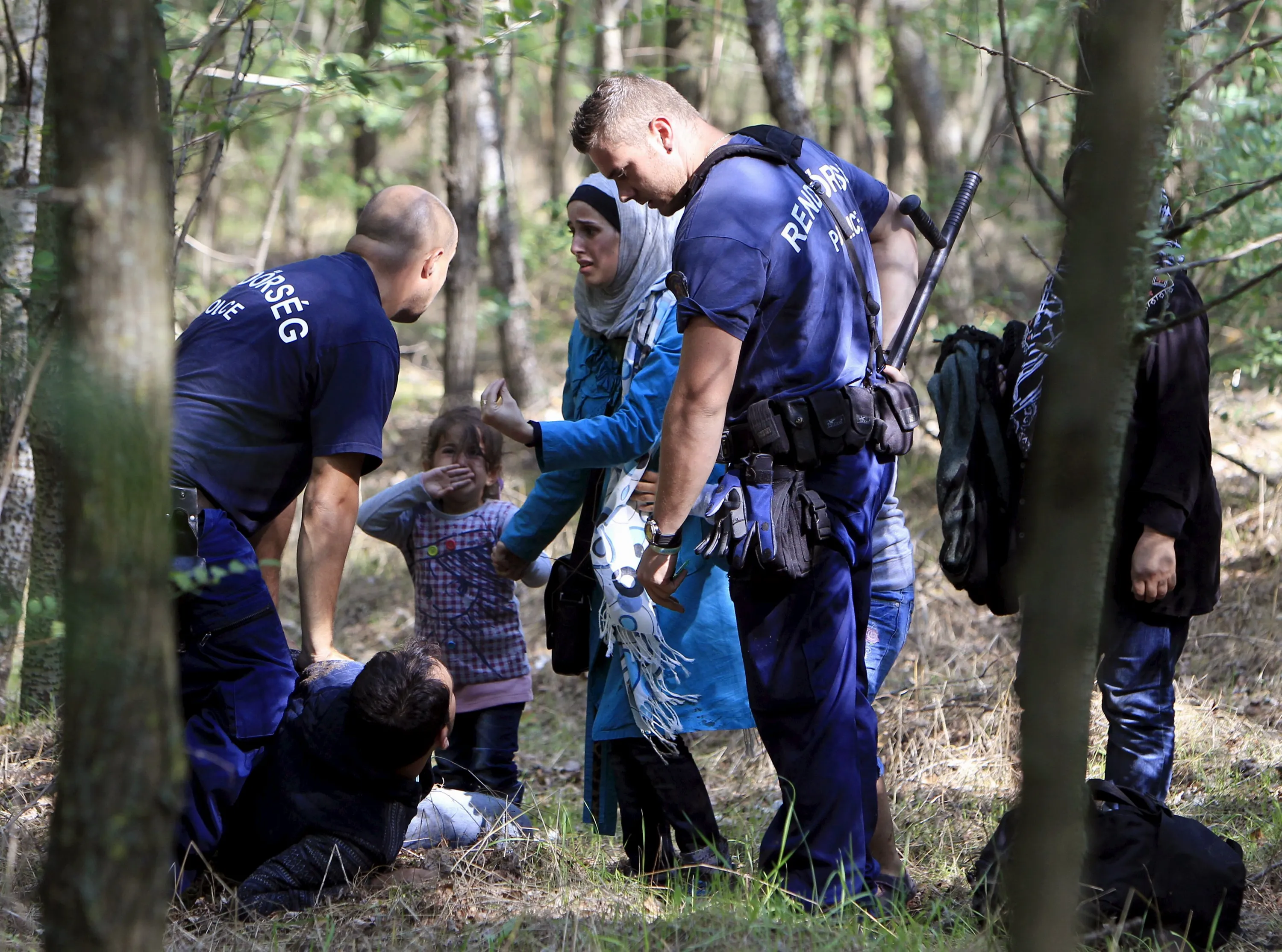 Hungarian policemen detain a Syrian migrant family after they entered Hungary at the border with Serbia, near Roszke, Hungary August 28, 2015. (Photo by Bernadett Szabo/Reuters)