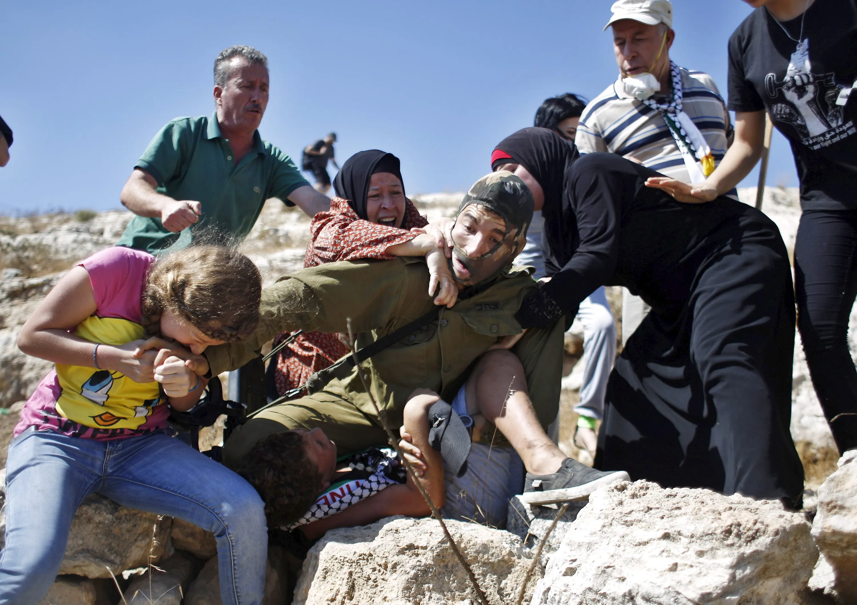 Palestinians scuffle with an Israeli soldier as they try to prevent him from detaining a boy during a protest against Jewish settlements in the West Bank village of Nabi Saleh, near Ramallah August 28, 2015. (Photo by Mohamad Torokman/Reuters)