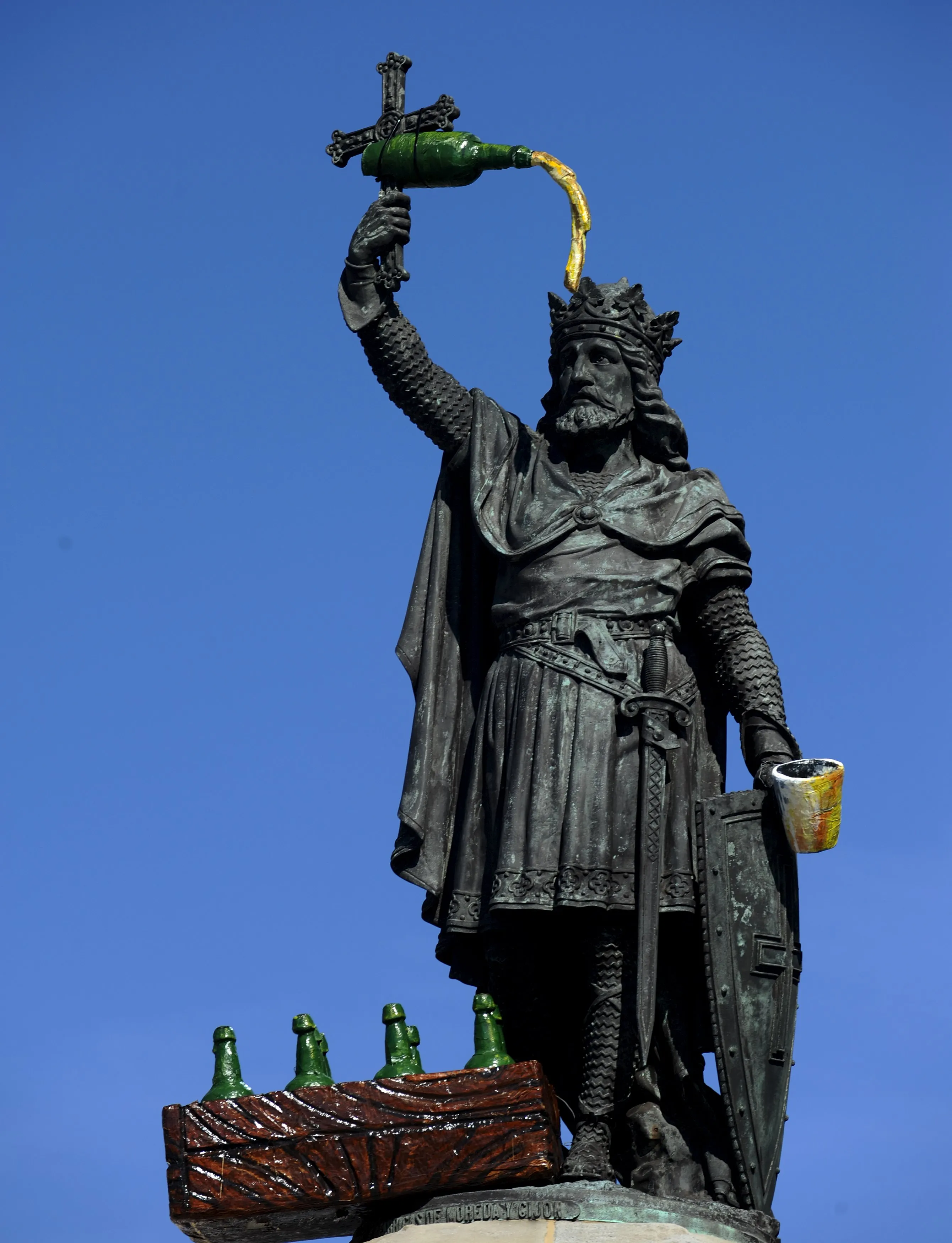 A sculpture representing the first king of the Asturias region, King Pelayo, decorated like a cider pourer is seen during the annual Fiesta de la Sidra Natural (Natural Cider Party) in Gijon, northern Spain, August 28, 2015. (Photo by Eloy Alonso/Reuters)