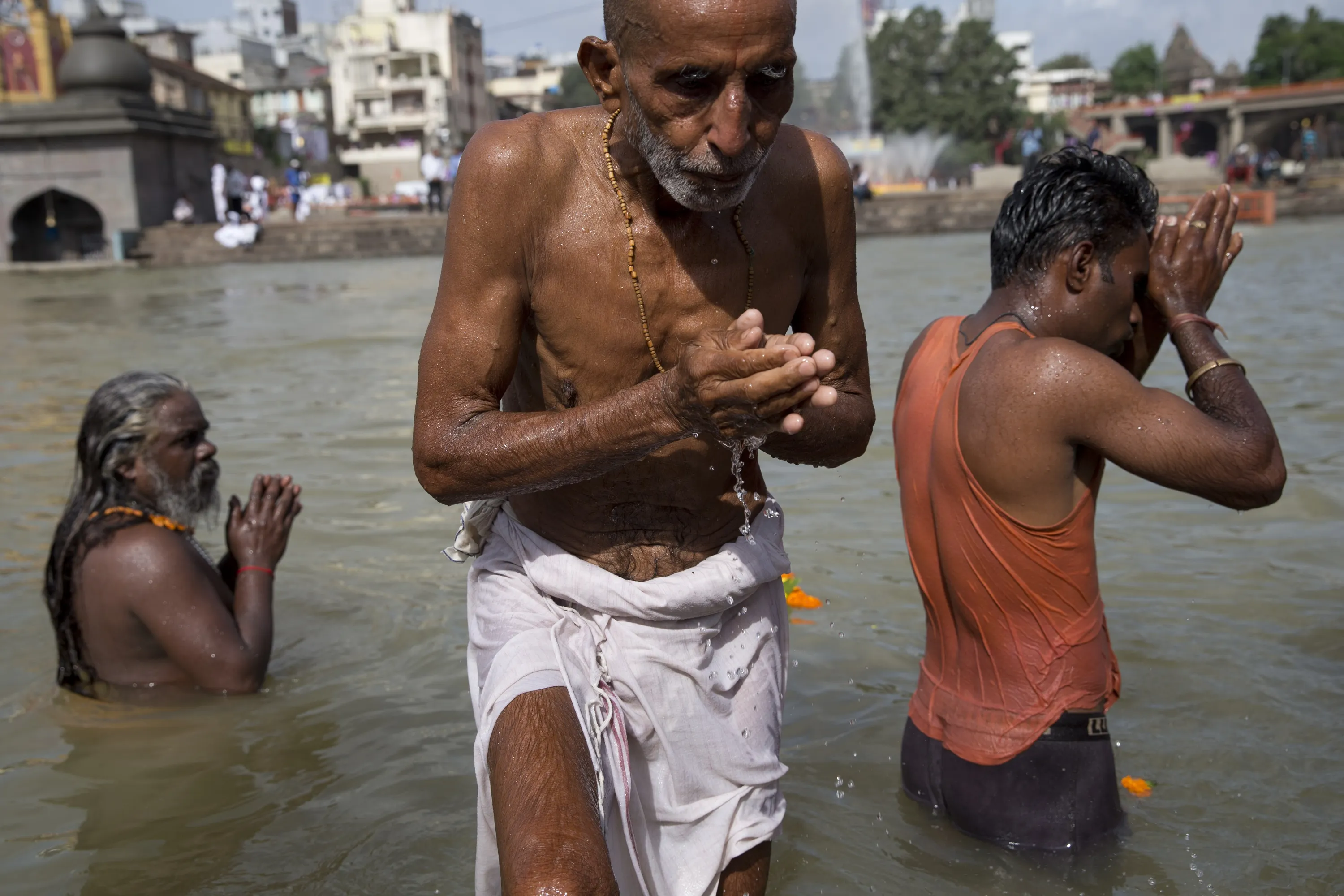 Indian Sadhus, or Hindu holy men, bath in the Godavari River during Kumbh Mela, or Pitcher Festival in Nasik, India, Saturday, August 29, 2015. According to Hindu mythology, the Kumbh Mela celebrates the victory of gods over demons in a furious battle over a nectar that would give them immortality. As one of the gods fled with a pitcher of the nectar across the skies, it spilled on four Indian towns- Allahabad, Nasik, Ujjain and Haridwar. (Photo by Tsering Topgyal/AP Photo)