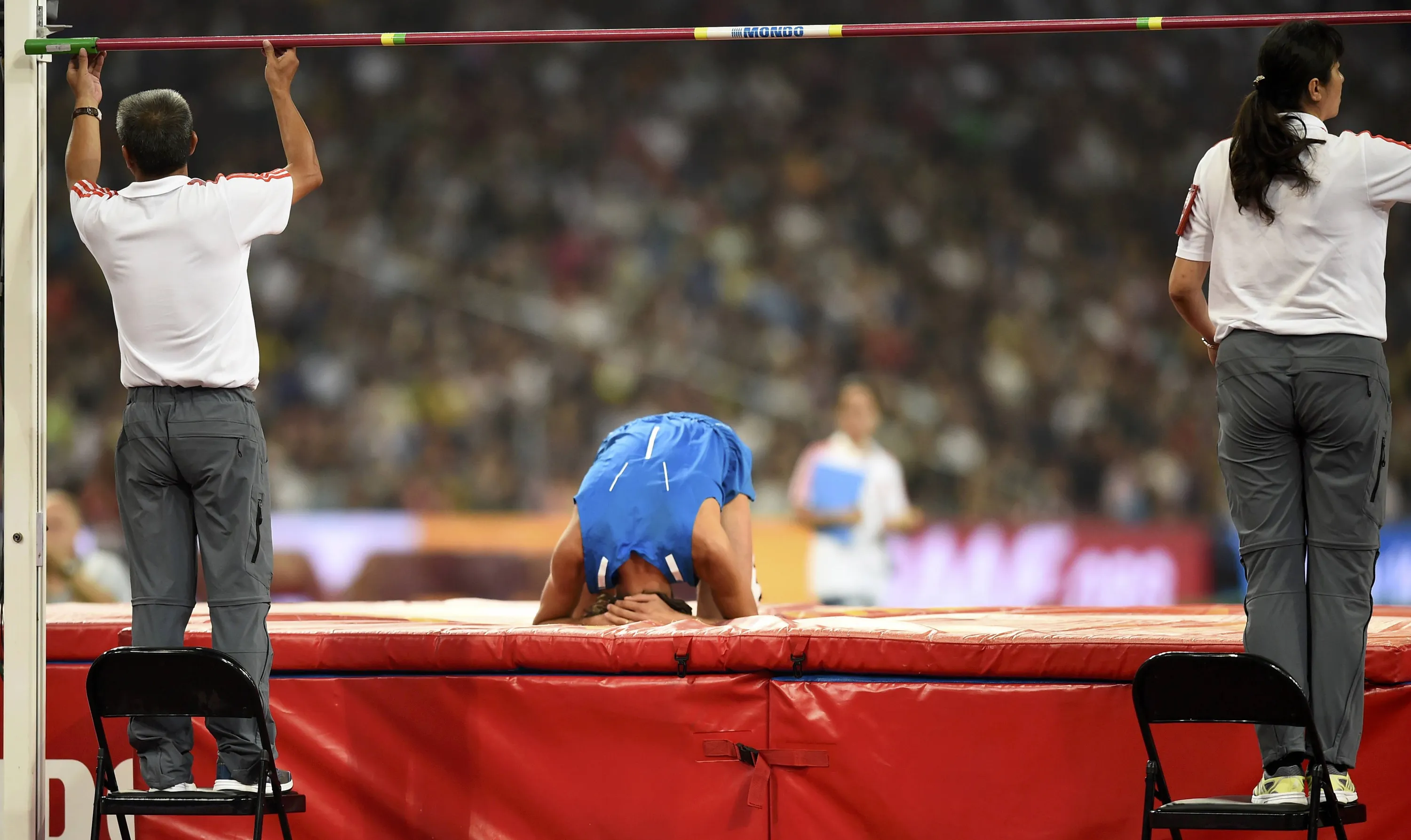 Gianmarco Tamberi of Italy reacts as the officials reset the bar in the men's high jump final during the 15th IAAF World Championships at the National Stadium in Beijing, China, August 30, 2015. (Photo by Dylan Martinez/Reuters)