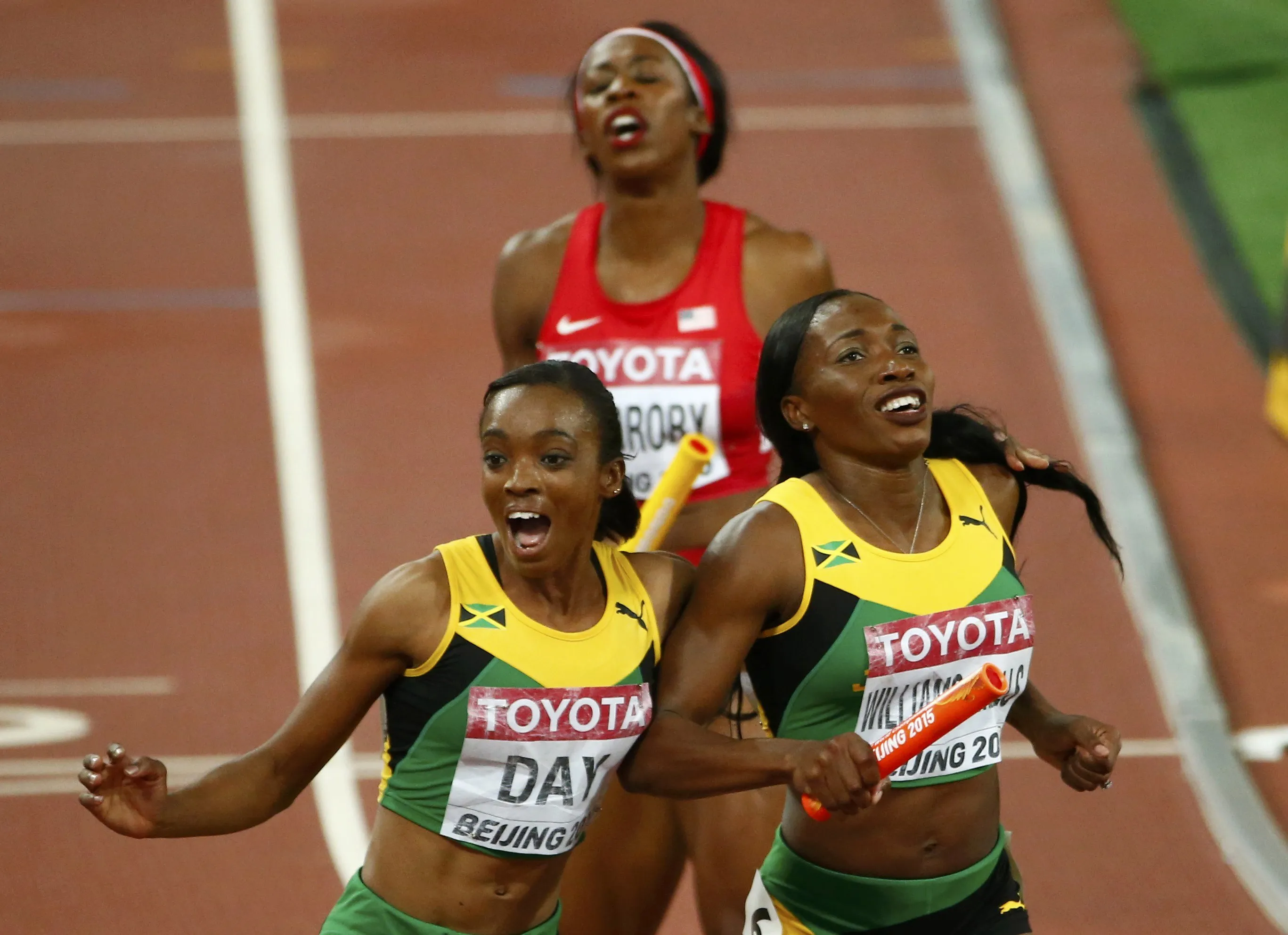Novlene Williams-Mills of Jamiaca (L) and Christine Day of Jamaica celebrate after crossing the finish line in the women's 4 x 400 metres relay final during the 15th IAAF World Championships at the National Stadium in Beijing, China August 30, 2015. (Photo by David Gray/Reuters)