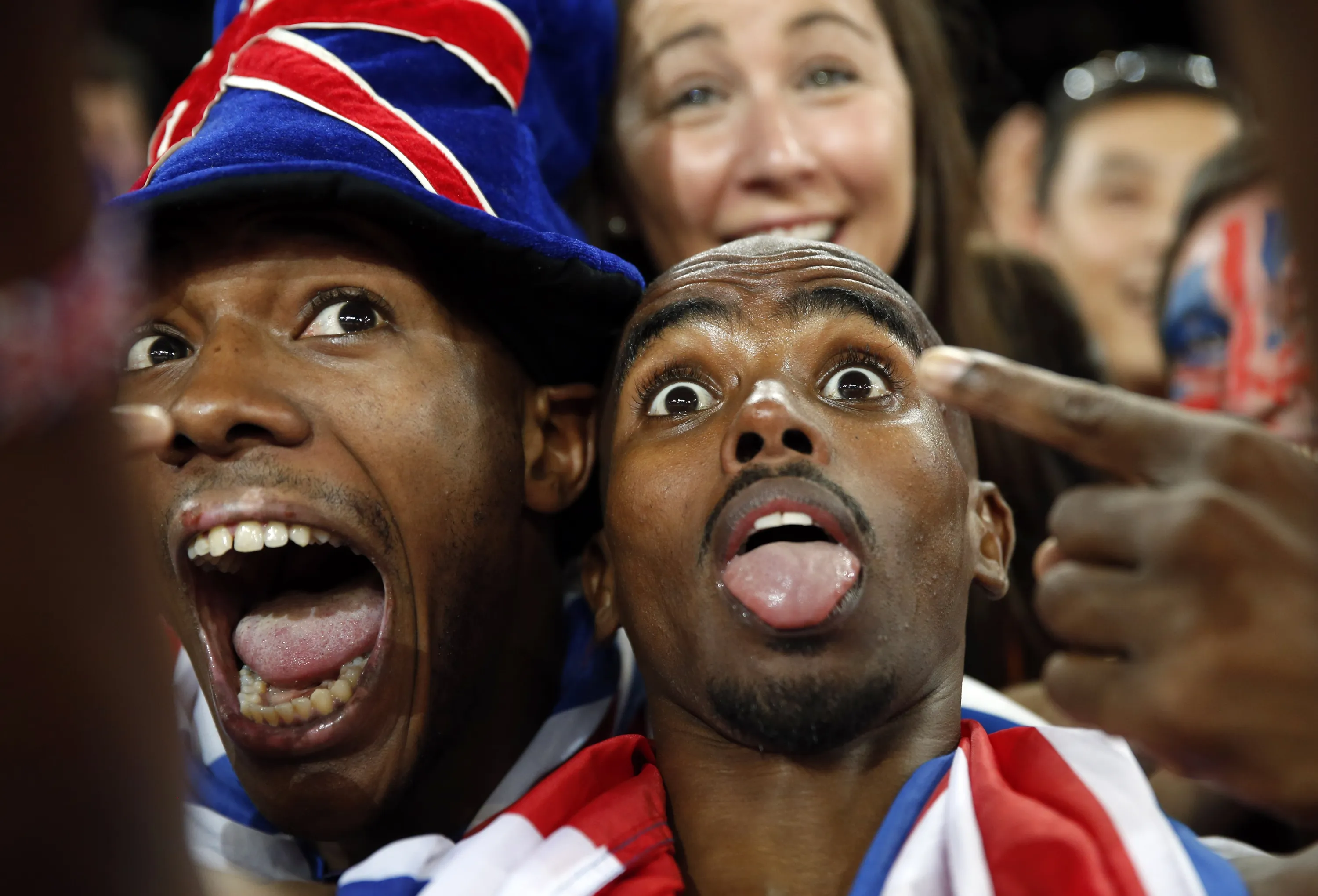 Britain's Mo Farah has a selfie taken with spectators as he celebrates after winning the gold medal in the men's 5000m final at the World Athletics Championships at the Bird's Nest stadium in Beijing, Saturday, August 29, 2015. (Photo by Ng Han Guan/AP Photo)