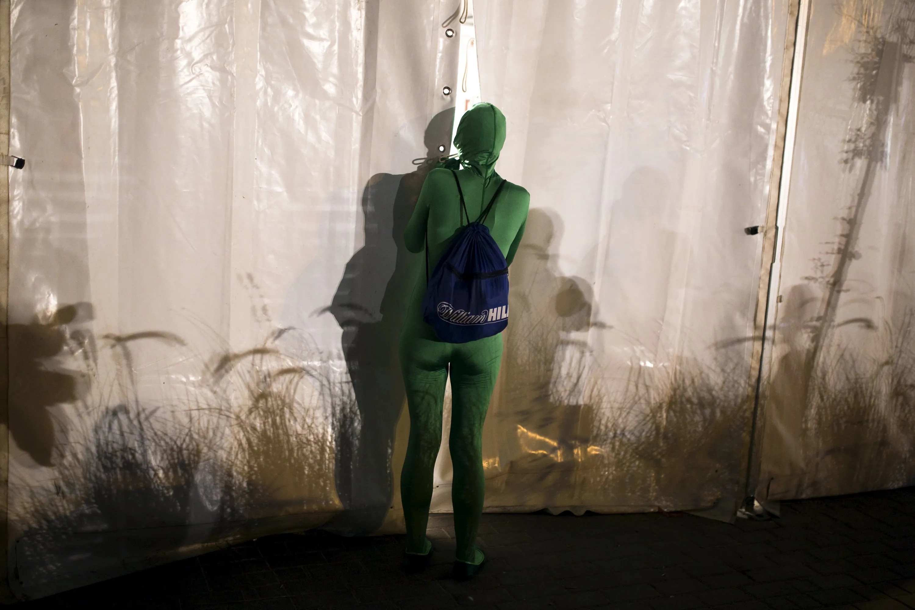 A woman, wearing her full solid-coloured bodysuit prepares before taking part in a street art performance in Bat Yam, near Tel Aviv, Israel August 29, 2015. (Photo by Amir Cohen/Reuters)