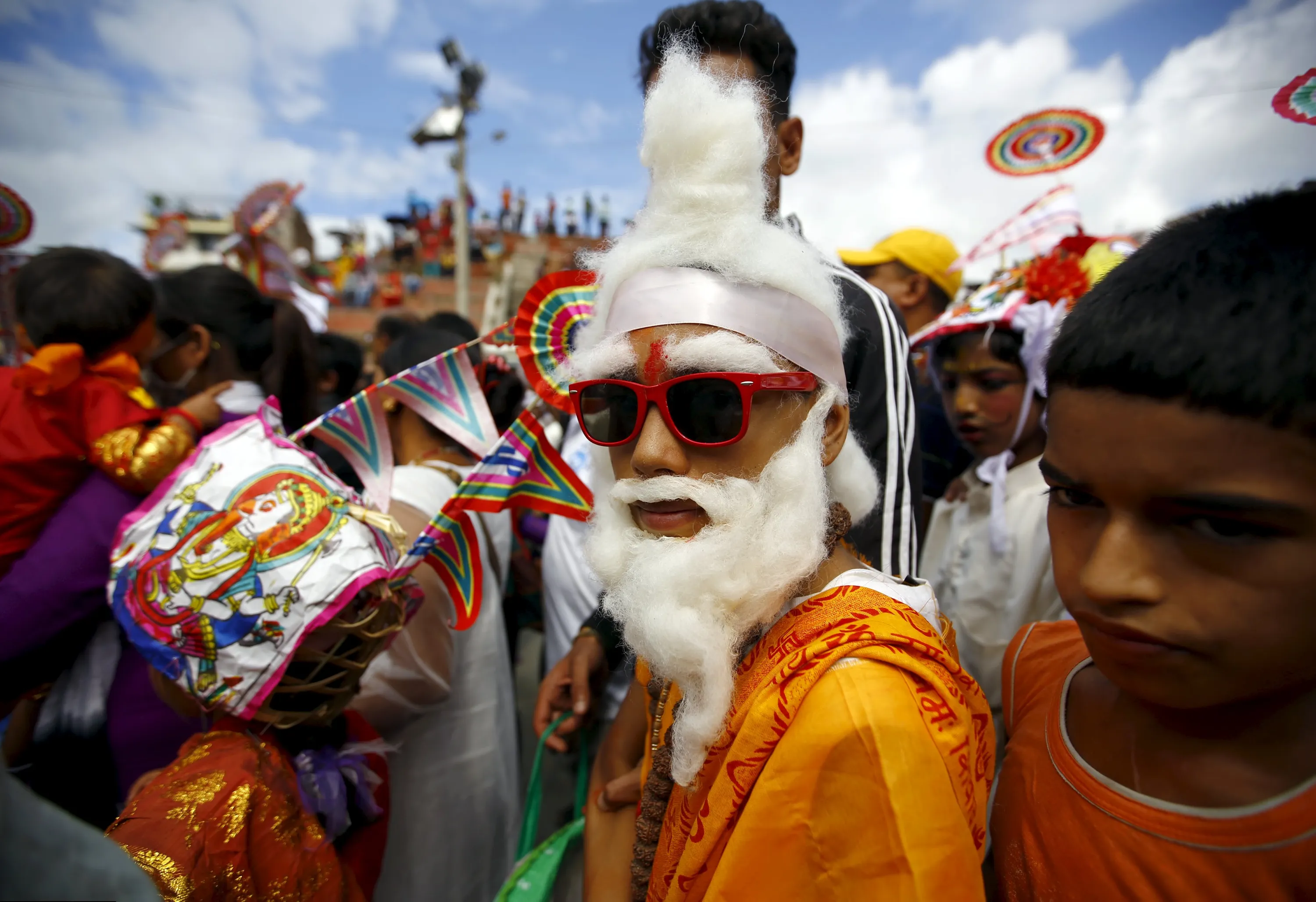 A boy (C), dressed up as a holy man, participates in a parade to mark the Gaijatra festival ,also known as “cow festival”, in Kathmandu, Nepal August 30, 2015. (Photo by Navesh Chitrakar/Reuters)