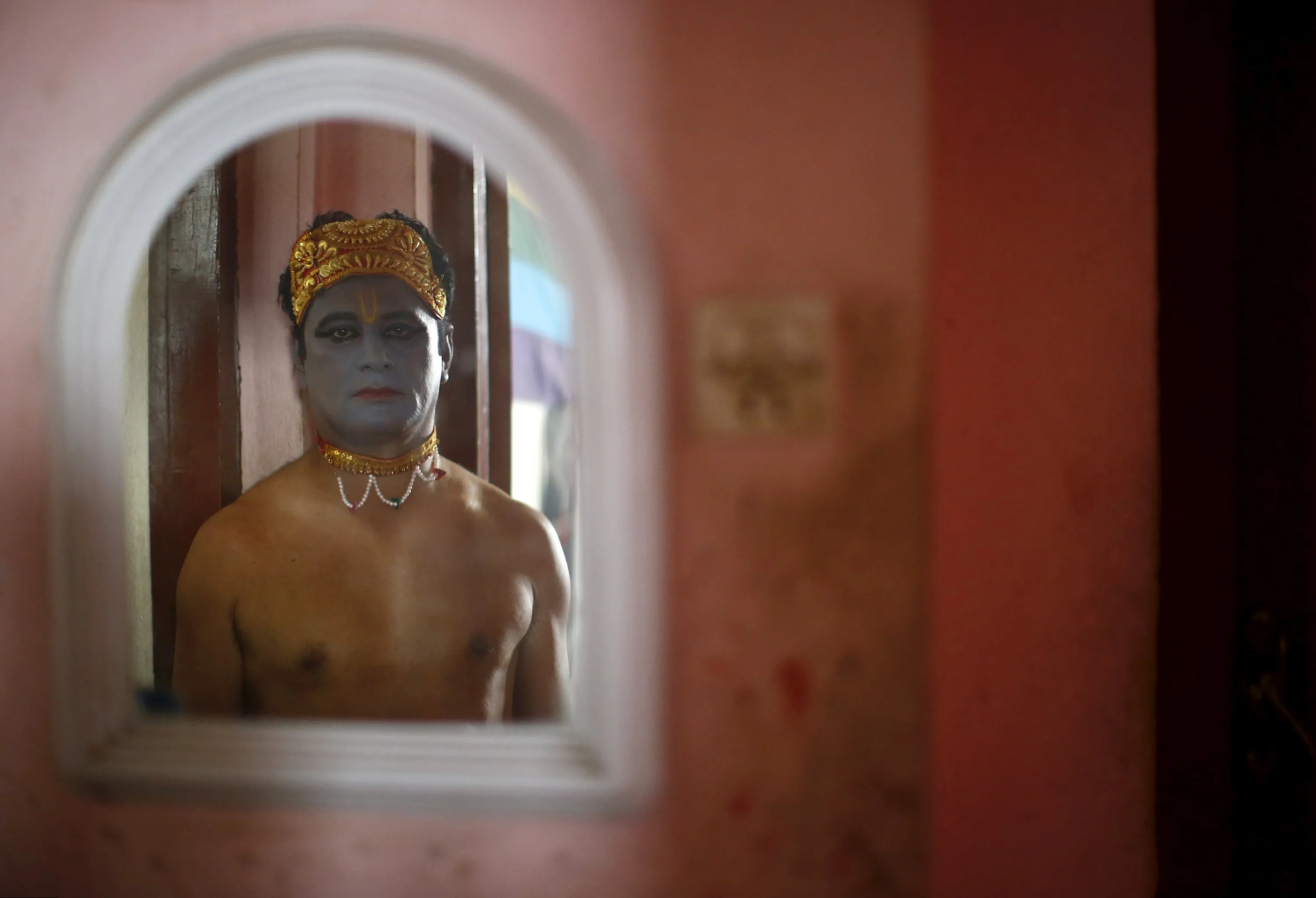 A reveller depicting Lord Krishna, a Hindu deity, is reflected in a mirror as he stands in a doorway before taking part in a LGBT (lesbian, gay, bisexual, and transgender) pride parade to mark Gaijatra Festival, also known as the festival of cows, in Kathmandu, Nepal August 30, 2015. (Photo by Navesh Chitrakar/Reuters)