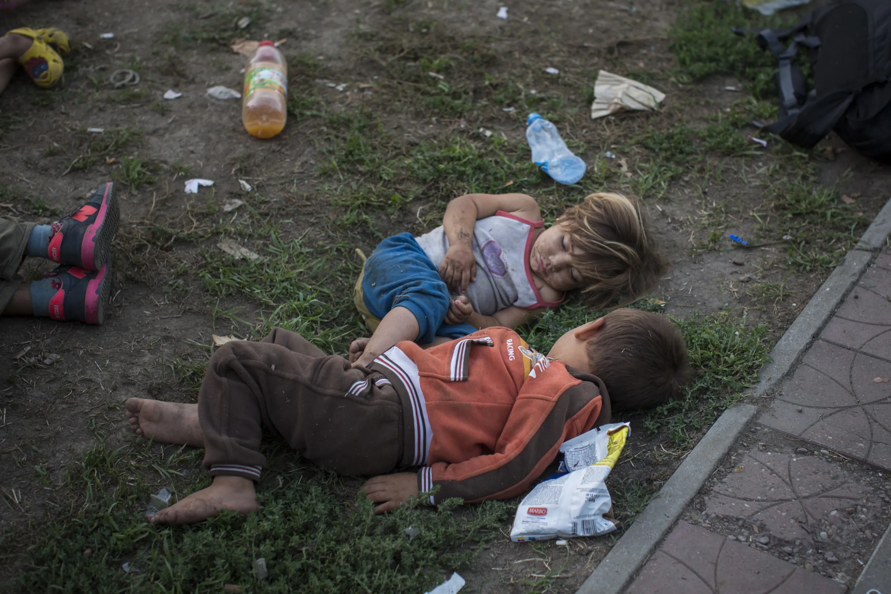 Syrian children sleep in a park in Belgrade, Serbia, early Sunday, August 30, 2015. Migrants including many women with babies and small children, sleep in a park in central Belgrade while waiting for an opportunity to travel north to cross the border with Hungary and enter the European Union. (Photo by Santi Palacios/AP Photo)