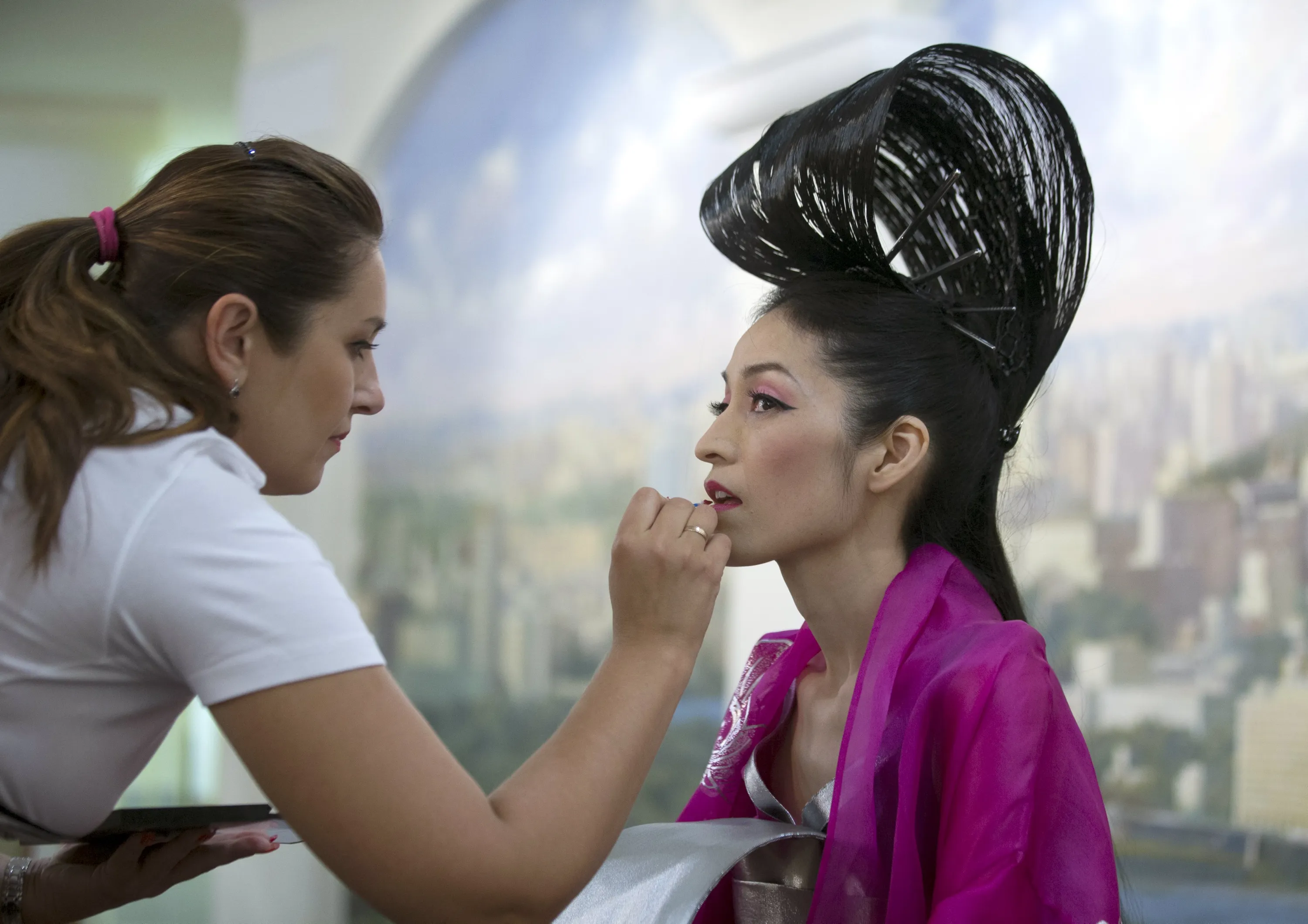 Takako Honda Hiruma of Japan prepares backstage during the “Mrs Universe 2015” contest in Minsk, Belarus, August 29, 2015. (Photo by Vasily Fedosenko/Reuters)