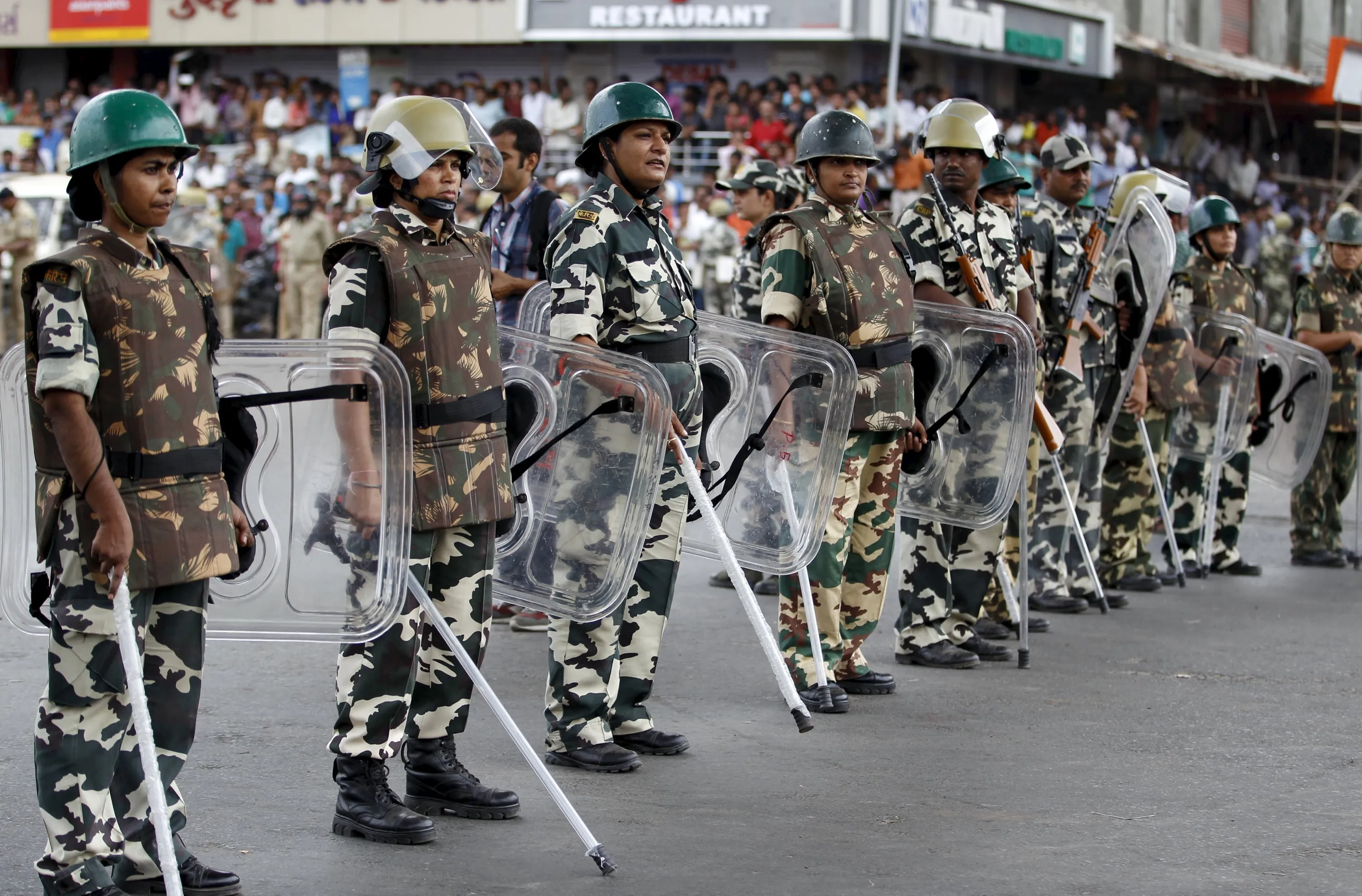 Paramilitary troopers stand guard during the funeral procession of Shwetang Patel in Ahmedabad, India, August 30, 2015. An Indian court in Gujarat state ordered crime investigators on Friday to investigate the death of 32-year old Patel, who allegedly died in police custody after he was taken away by the police during a protest. According to family members, Patel was picked up by police from his home in Bapunagar area after violence broke out in the state following a mammoth rally by the powerful Patel community seeking reserved jobs and education places. (Photo by Amit Dave/Reuters)