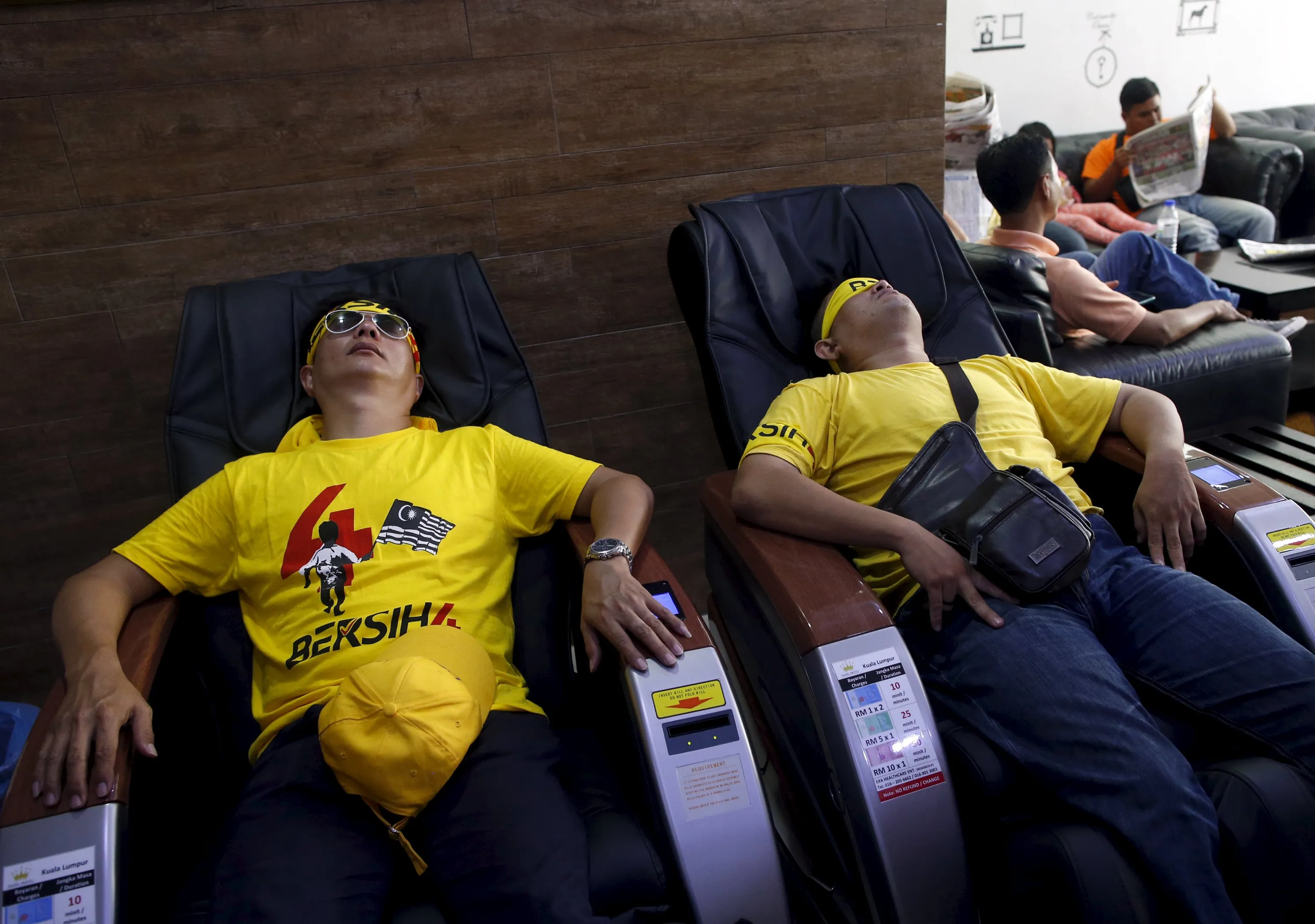 Supporters of pro-democracy group “Bersih” (Clean) sit in massage chairs as they rest at a hotel lobby after a morning of rallying in Malaysia's capital city of Kuala Lumpur August 30, 2015. (Photo by Edgar Su/Reuters)
