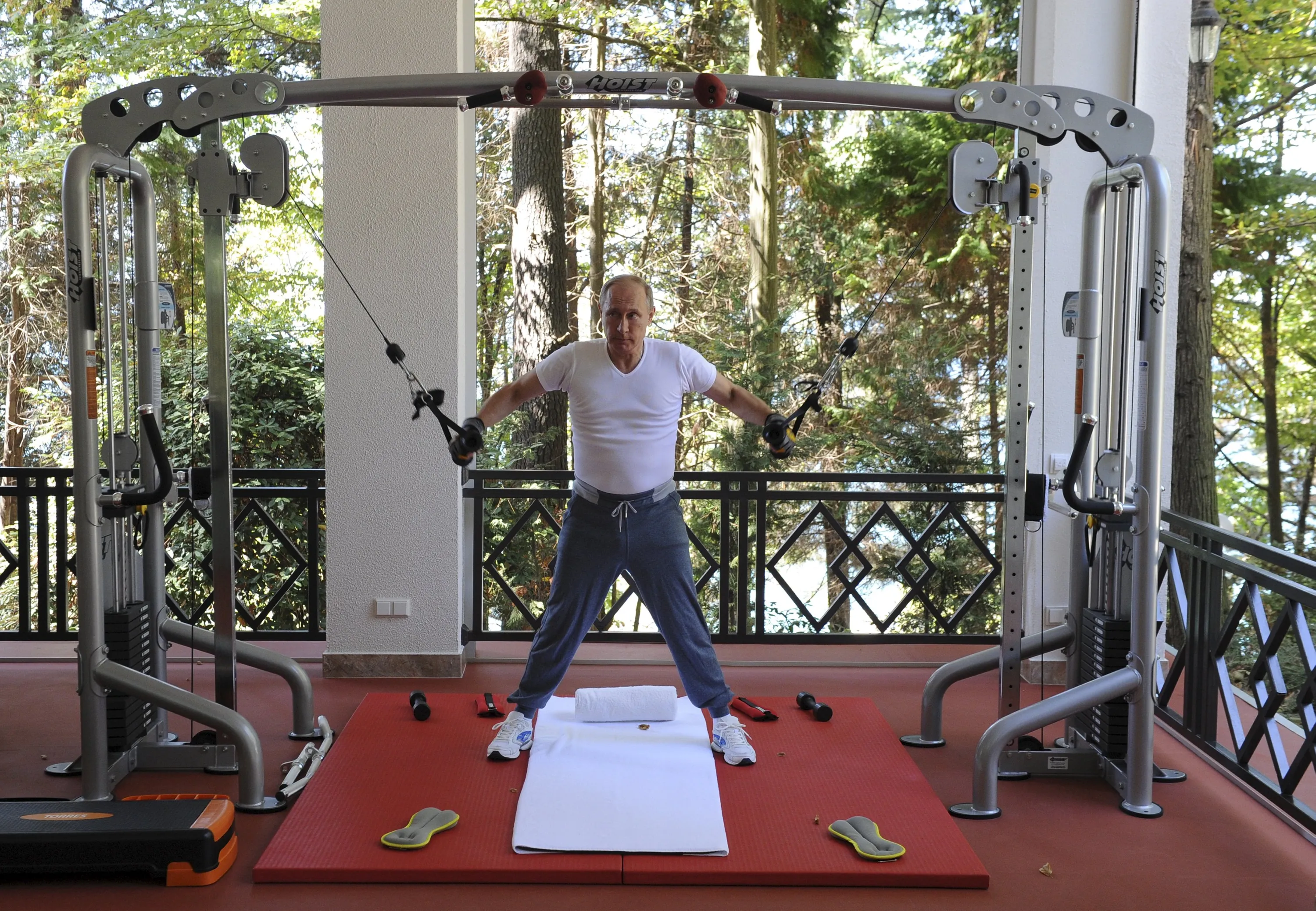Russian President Vladimir Putin exercises in a gym at the Bocharov Ruchei state residence in Sochi, Russia, August 30, 2015. (Photo by Michael Klimentyev/Reuters/RIA Novosti/Kremlin)