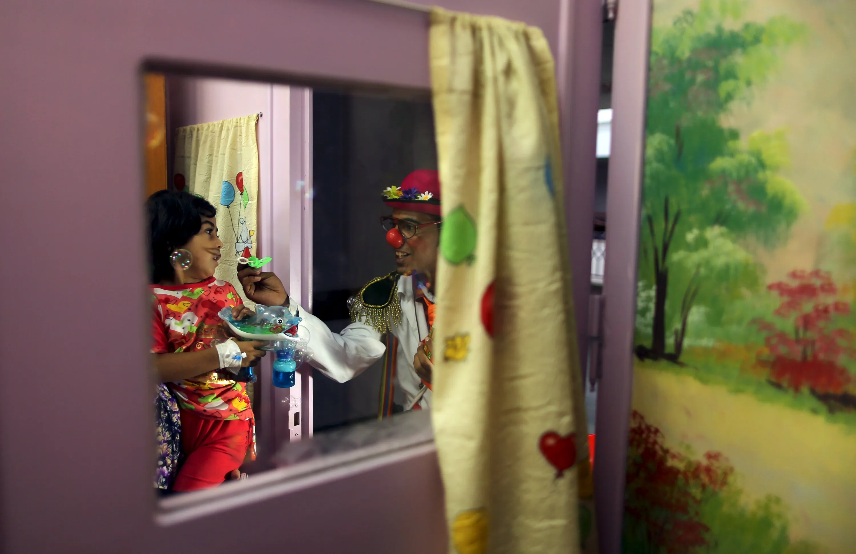 A Palestinian social activist working for the International South South Cooperation (Cooperazione Internazionale Sud Sud, or CISS) entertain children who are patients, while dressed as a clown inside a hospital in Gaza City August 31, 2015. (Photo by Mohammed Salem/Reuters)