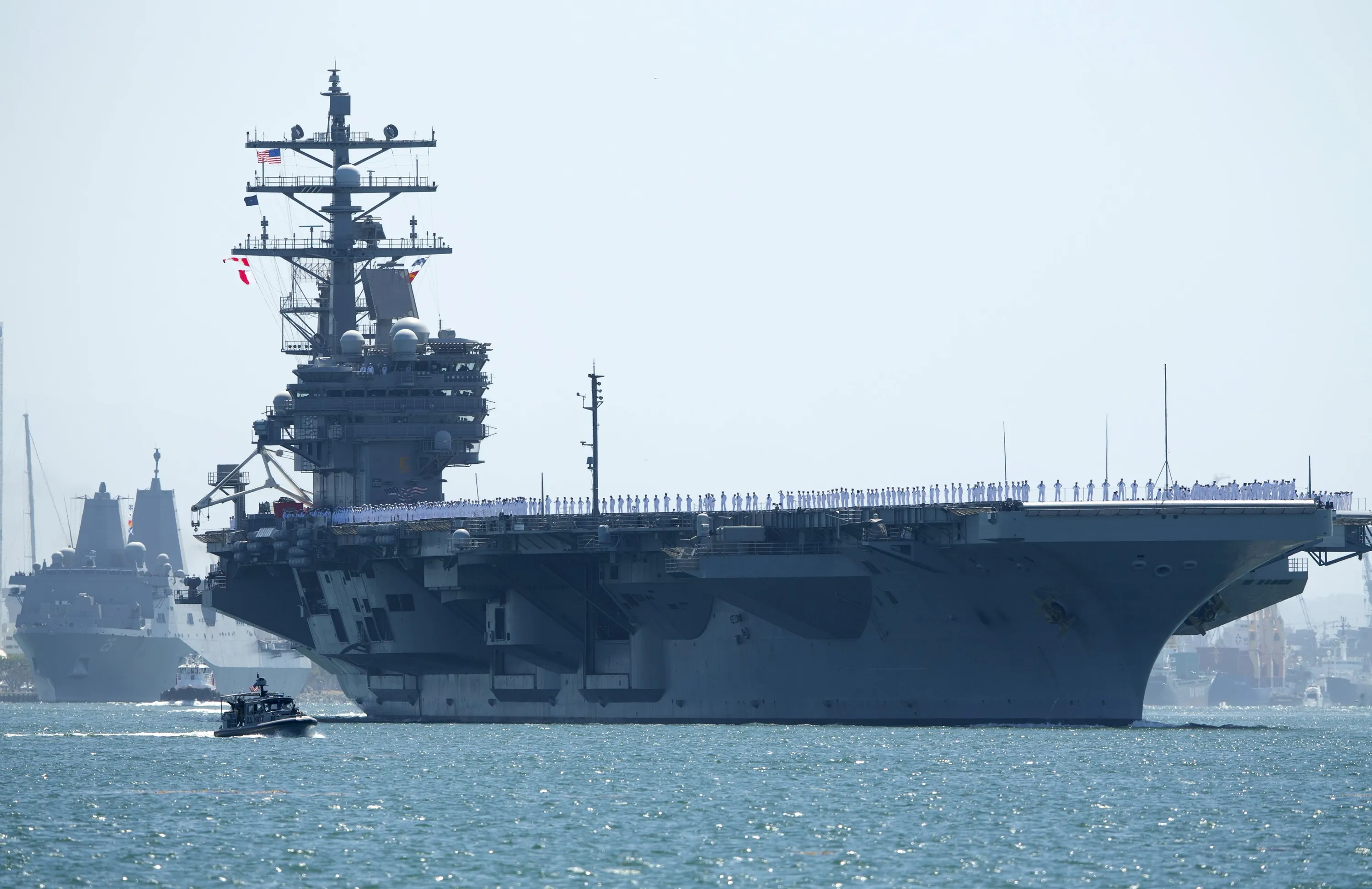 The USS Ronald Reagan, a Nimitz-class nuclear-powered super carrier, is followed by the USS Somerset as it departs for Yokosuka, Japan from Naval Station North Island in San Diego, California August 31, 2015. The Reagan is replacing the USS George Washington as part of a complicated three-carrier swap that exchanges crews for ships, saving the Navy millions in moving costs. (Photo by Mike Blake/Reuters)