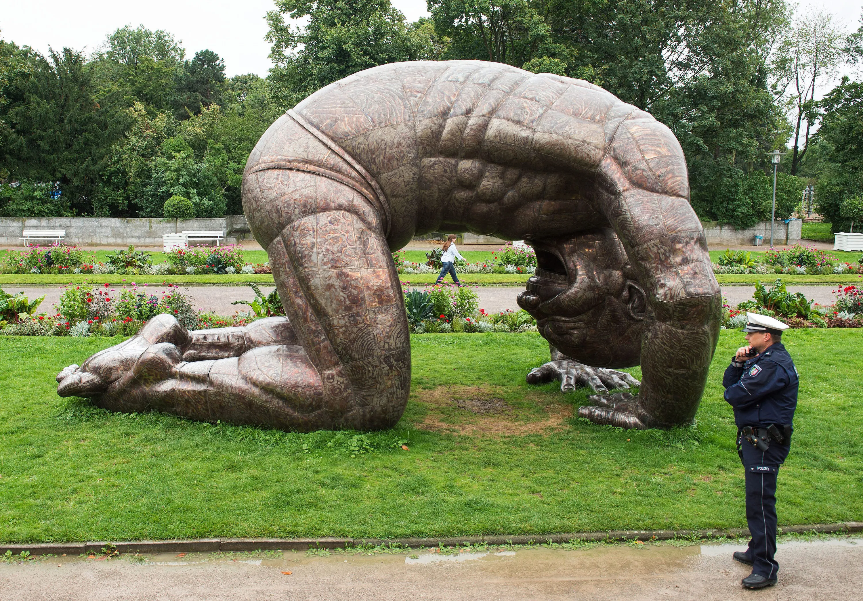 A policeman stands in front of the sculpture “Bending Man” by Yue Min Jung, during the arrival of German President Joachim Gauck (unseen) at the NRW-Forum in Duesseldorf, Germany, 01 September 2015. Gauck visited the China 8 exhibition of contemporary Chinese art that runs until 13 September. (Photo by Bernd Thissen/EPA)
