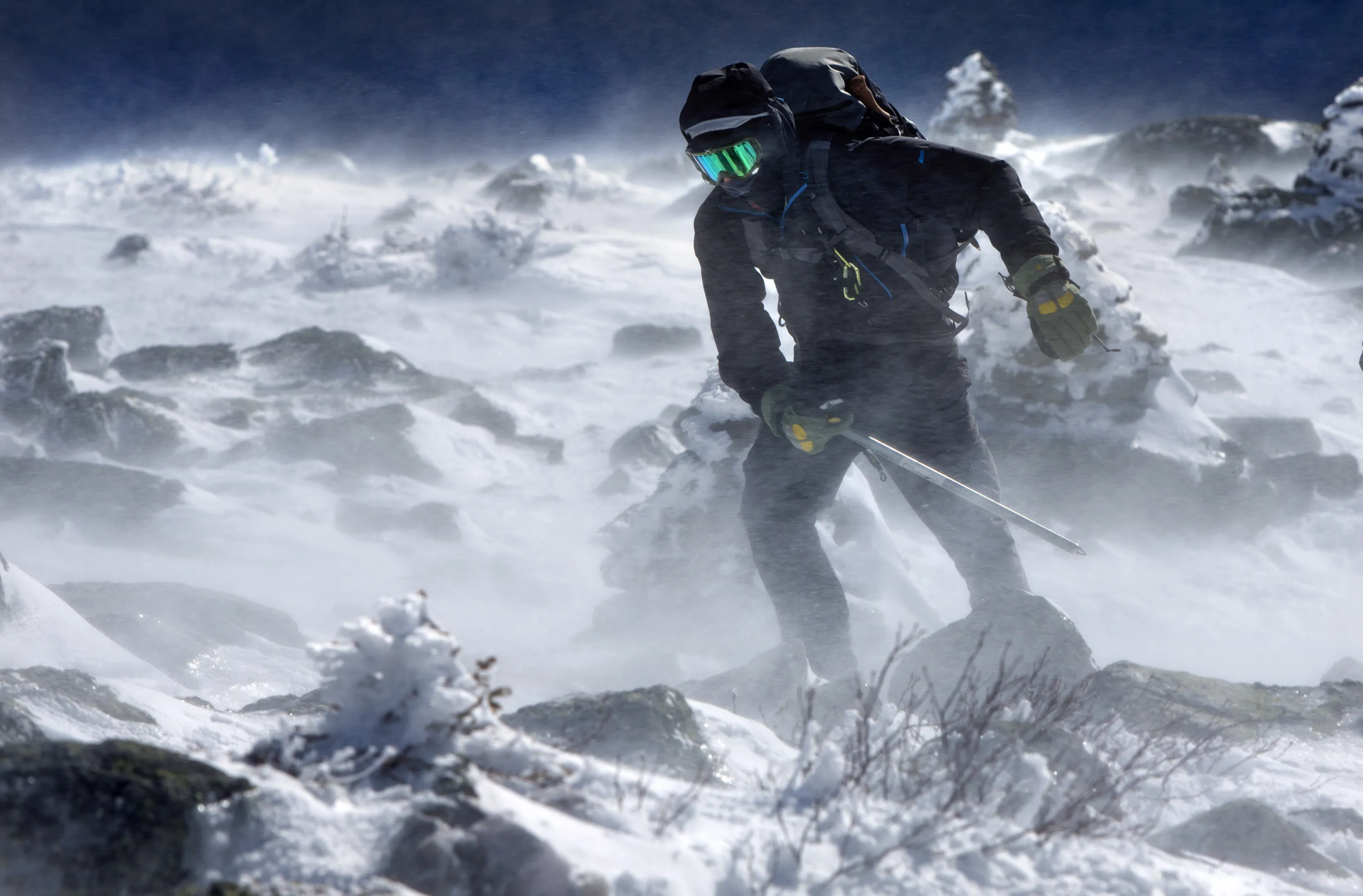 Strong winds kick up to challenge Canadian climber Michael LaRose, of Montreal, as he travels through the Alpine Garden, an area known for vegetation commonly found in the northern tundra, below the summit of Mt. Washington, Saturday, March 30, 2013, in New Hampshire. (Photo by Robert F. Bukaty/AP Photo)