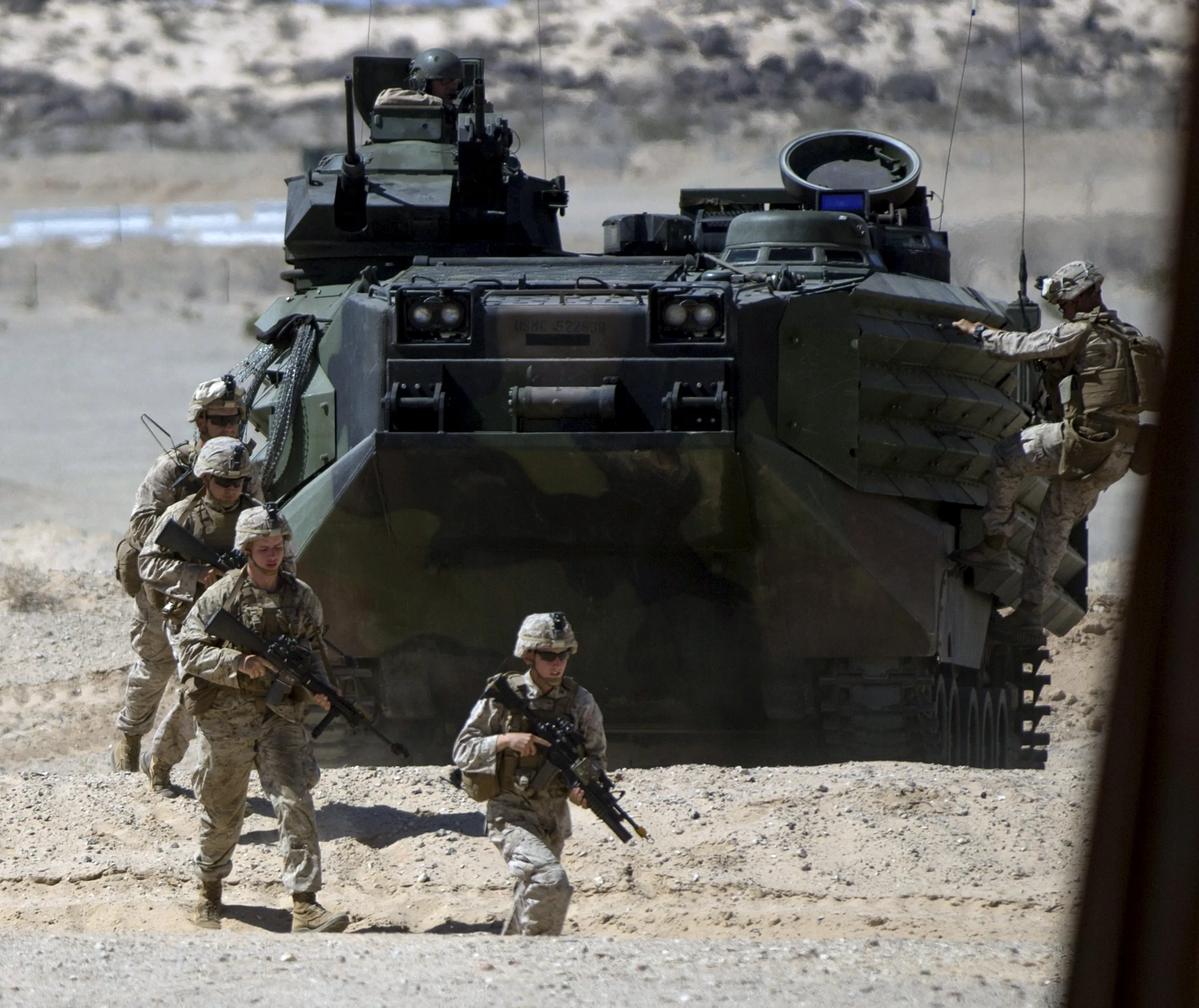 U.S. Marines from Fox Company, 2nd Battalion 1st Marines, 13th Marine Expeditionary Unit clear ahead of an Amphibious Assault Vehicle (AAV) during a non-live fire Military Operations in Urban Terrain (MOUT) training at US Marine Corps: Marines Air Ground Combat Center in Twentynine Palms, California September 1, 2015. (Photo by Mario Anzuoni/Reuters)
