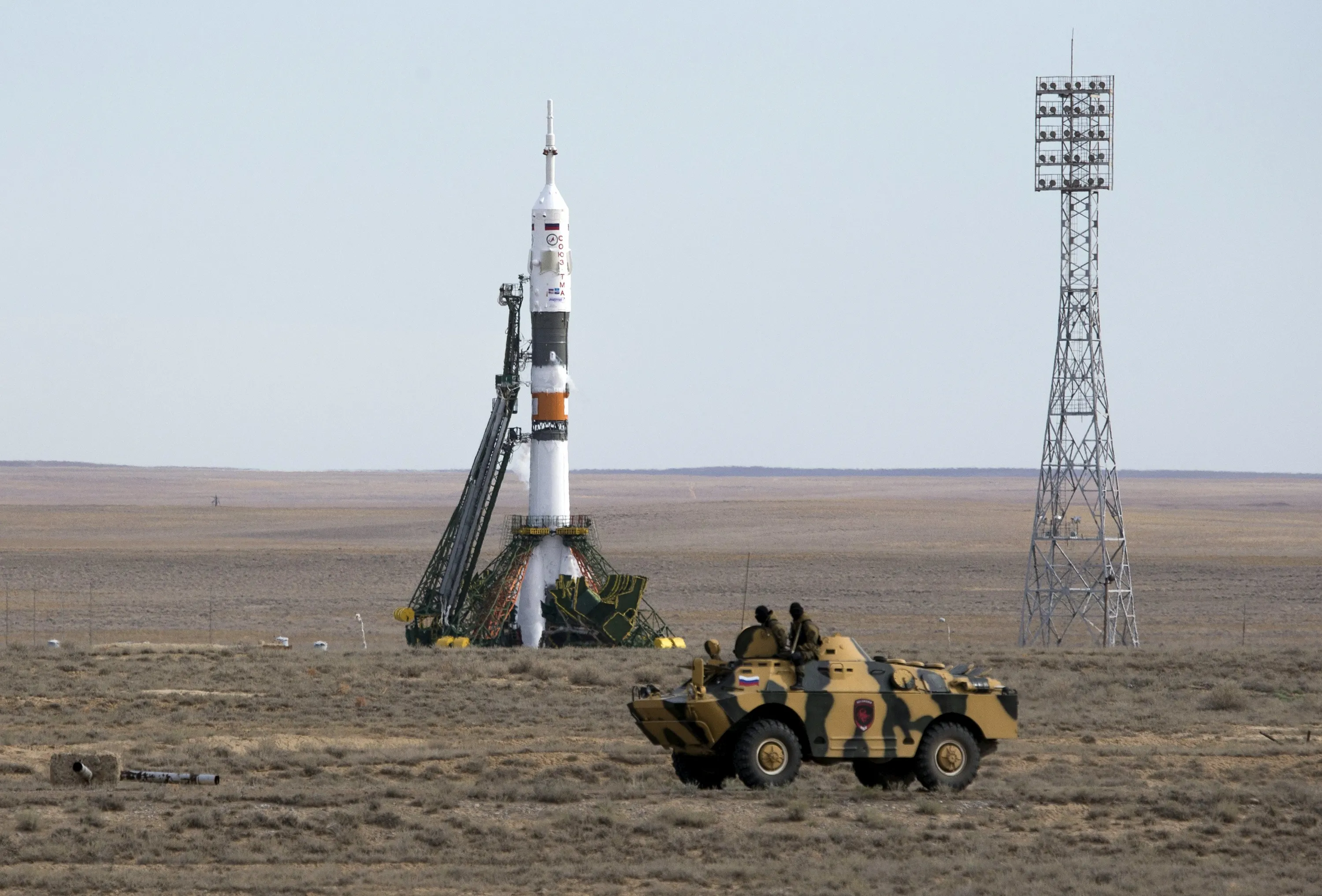 An armoured personnel carrier (APC) drives in front of the Soyuz TMA-18M spacecraft shortly before the launch with the international crew at the Baikonur cosmodrome, Kazakhstan, September 2, 2015. (Photo by Shamil Zhumatov/Reuters)