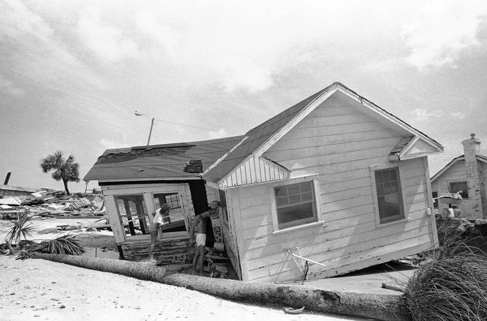 Residents of Indian Rocks Beach, Fla., look inside a damaged house on September 3, 1985. They were allowed to return to their house to inspect the damage. (Photo by Raul de Molina/AP Photo)