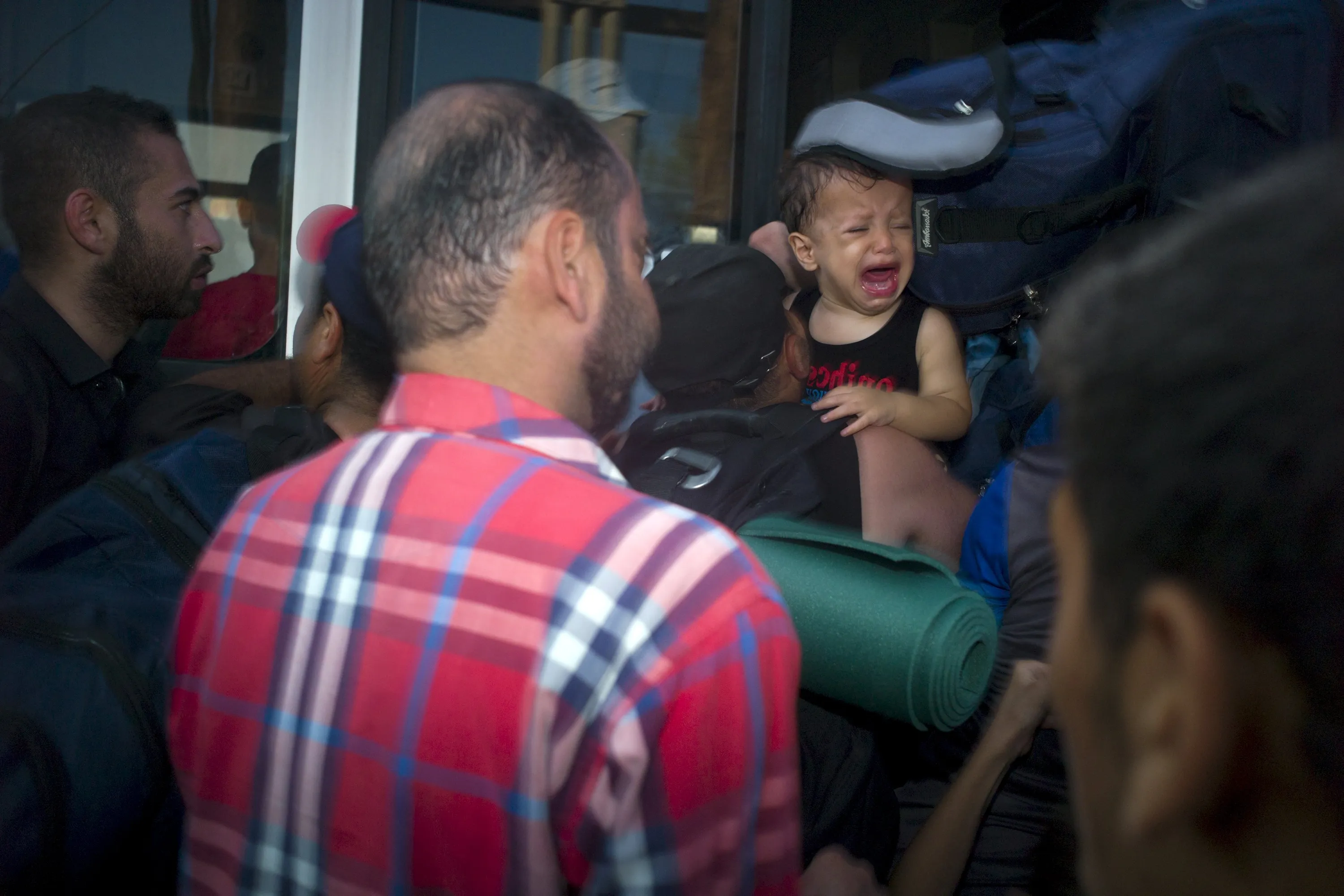 A baby cries as migrants line up for a registration procedure at the port of Mytilene on the Greek island of Lesbos, September 3, 2015. (Photo by Dimitris Michalakis/Reuters)