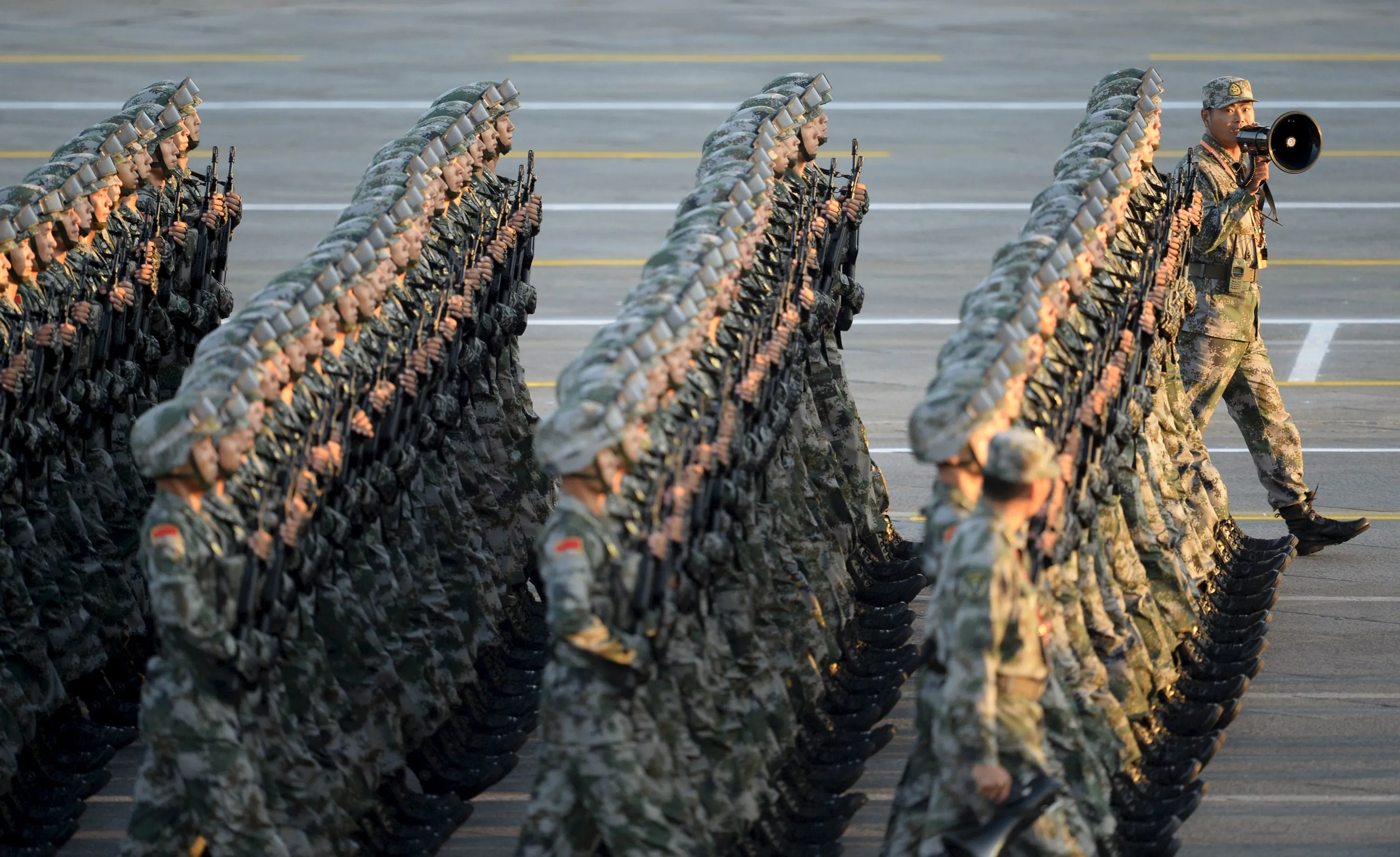 An officer (R) gives instructions as People's Liberation Army (PLA) soldiers march in formation on the Tiananmen Square during a rehearsal ahead of a military parade to mark the 70th anniversary of the end of World War Two, in Beijing, China, September 3, 2015. (Photo by Reuters/Stringer)