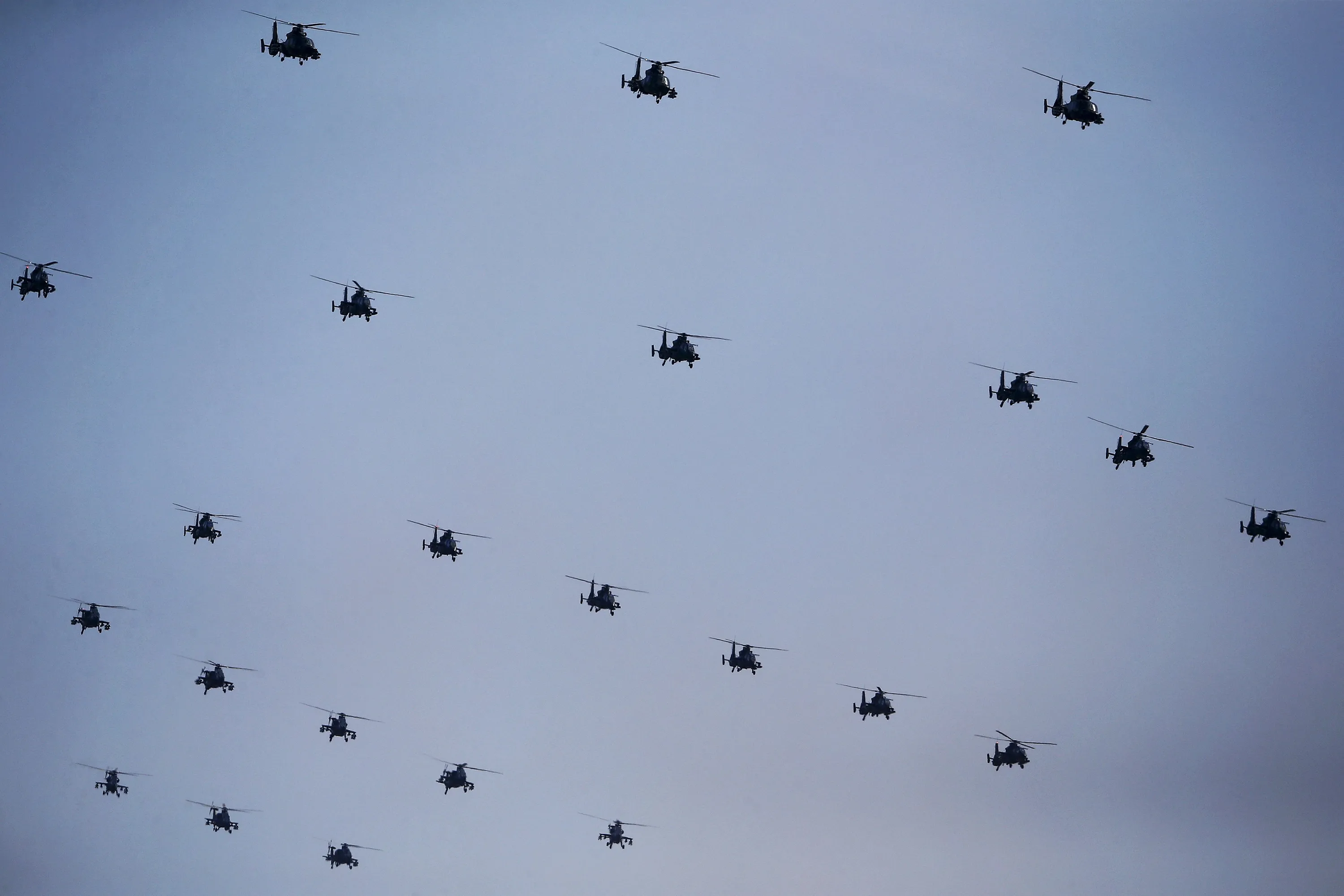Military helicopters fly over Tiananmen Square during the military parade marking the 70th anniversary of the end of World War Two, in Beijing, China, September 3, 2015. (Photo by Damir Sagolj/Reuters)