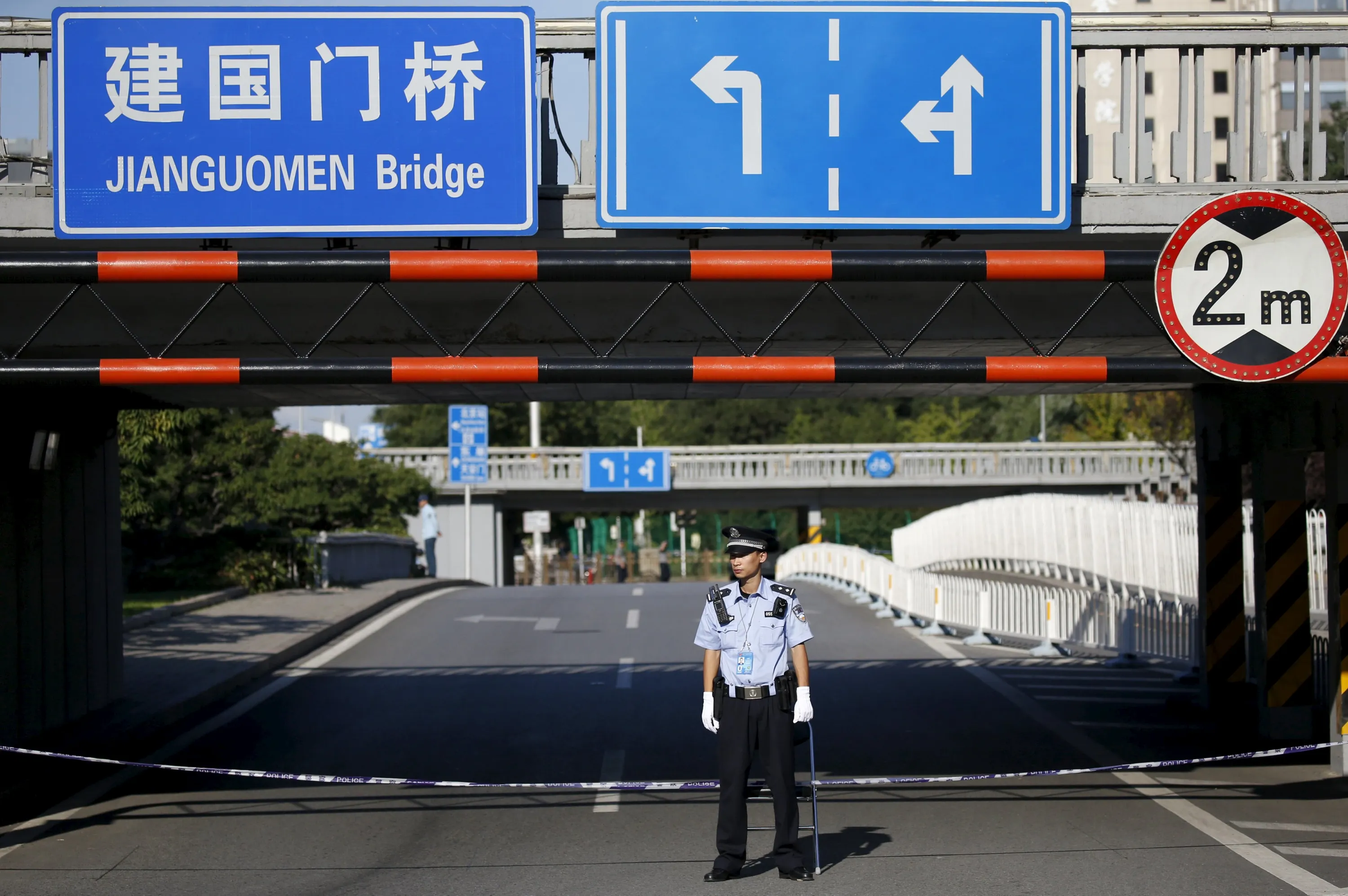 A policeman stands guard on a blocked road on the side of Changan Avenue, ahead of the military parade to mark the 70th anniversary of the end of World War Two, in Beijing, China, September 3, 2015. (Photo by Kim Kyung-Hoon/Reuters)