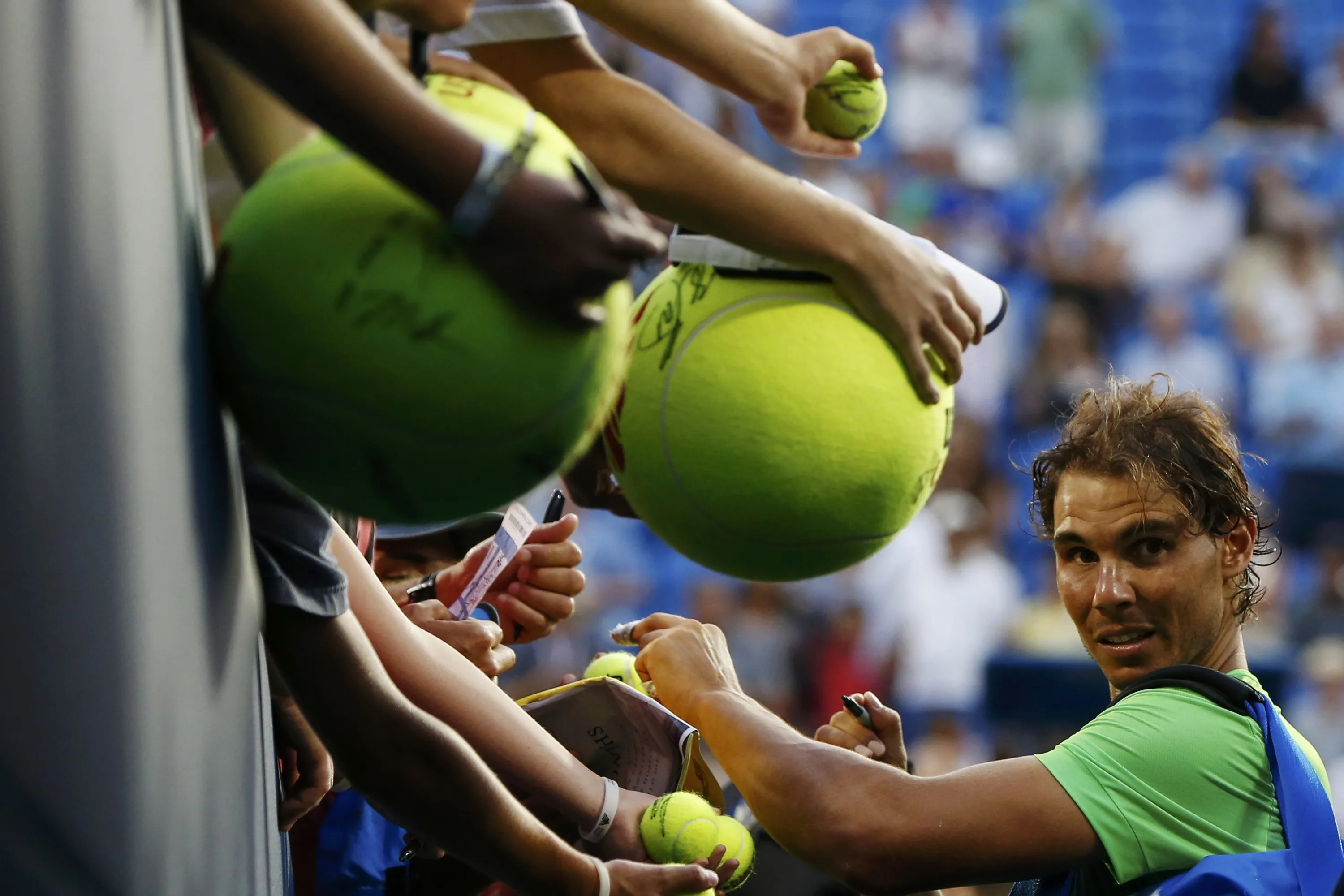 Rafael Nadal of Spain signs autographs for fans following his victory over Diego Schwartzman of Argentina during their second round match at the U.S. Open Championships tennis tournament in New York, September 2, 2015. (Photo by Shannon Stapleton/Reuters)