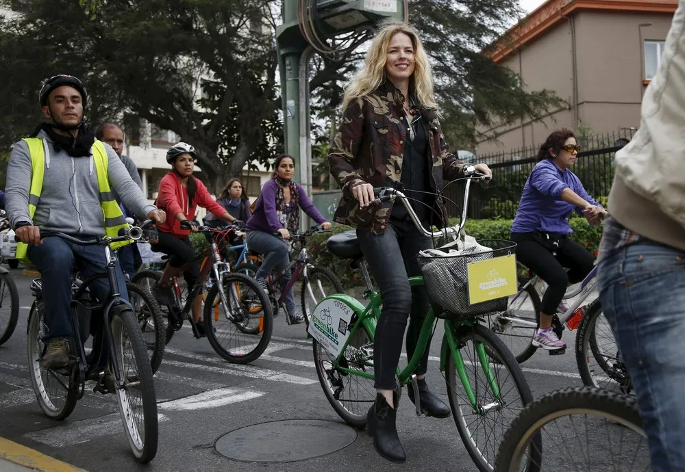 Spanish singer Christina Rosenvinge, a former member of the “Christina y Los Subterraneos” (“Christina and the Underground”) band, participates in a bike ride with bicycle activists in Lima's Miraflores district, Peru September 2, 2015. (Photo by Janine Costa/Reuters)