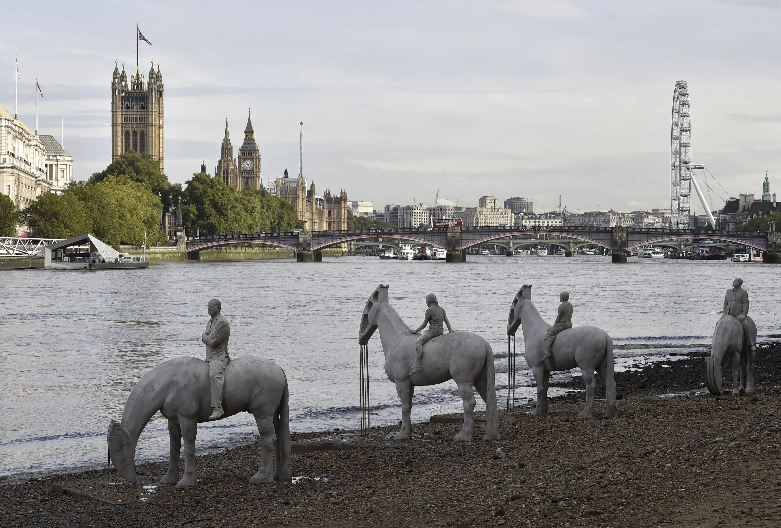 Sculptures entitled “The Rising Tide” by British sculptor Jason deCaires Taylor are seen beside the River Thames in front of the Houses of Parliament and the London Eye ferris wheel in London, September 3, 2015. The representations of four horses and riders are fully visible at low tide but become immersed underwater twice a day as the Thames rises to reach full tide. The installation will be on display throughout September as part of the annual Totally Thames festival. (Photo by Toby Melville/Reuters)