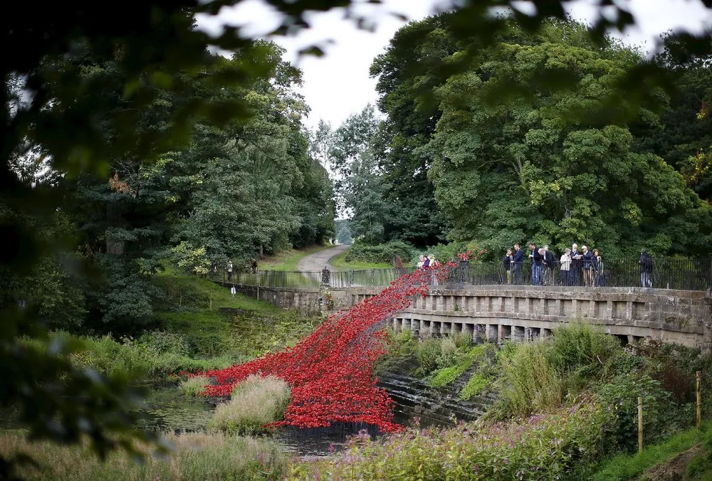 Visitors look at a poppies installation titled “Wave” by Paul Cummins at Yorkshire Sculpture Park near Wakefield, Britain September 3, 2015. The Wave poppies installation was originally part of “Blood Swept Lands and Seas” which was created to mark the centenary of the First World War and was sited at the Tower of London in 2014. (Photo by Darren Staples/Reuters)