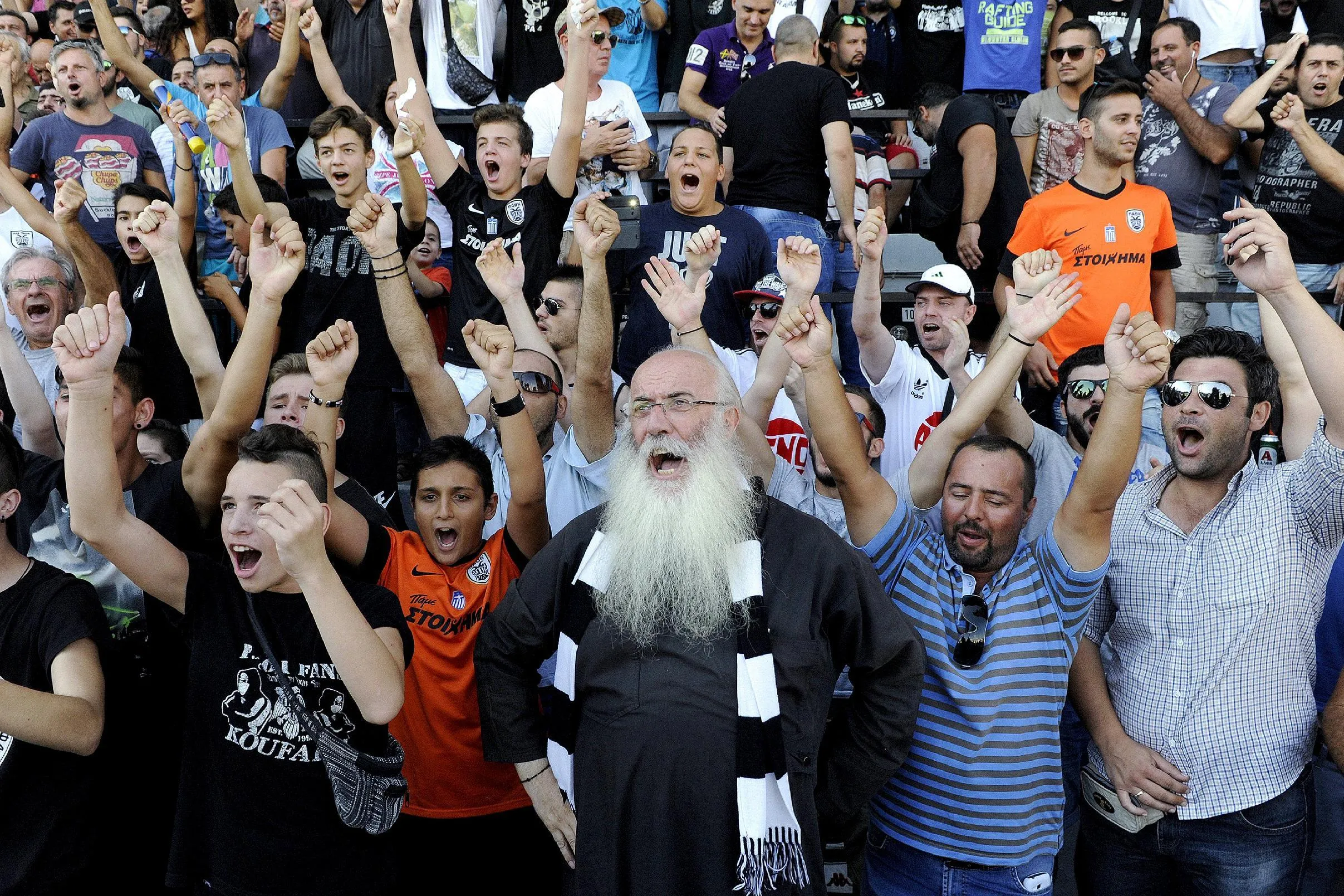 PAOK fans, among them a Greek Orthodox priest (C), cheer for Bulgarian forward Dimitar Berbatov (not pictured) during his presentation at the Toumba Stadium in Thessaloniki, Greece, September 3, 2015. Berbatov was treated to a hero's welcome on Thursday as 10,000 jubilant PAOK Salonika fans turned up to greet the club's new signing at their Toumba Stadium. (Photo by Alexandros Avramidis/Reuters)