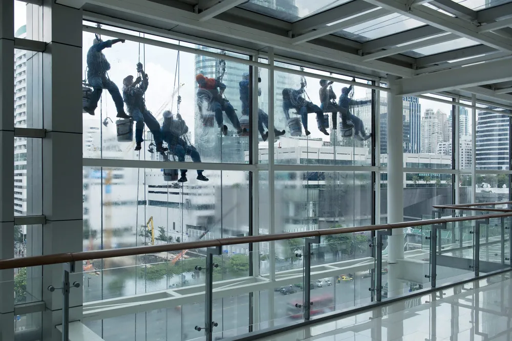 Window cleaners wash the windows of a luxury shopping mall in Bangkok, Thailand, 03 September 2015. Thailand economy is continuing its sluggish recovery pace and the Thai military junta government has revised the gross domestic product (GDP) growth in 2015 down to 2.0 to 3.0 percent from 2.7 to 3.2 percent of earlier project due to a lagging exports performance, a failed improvement of domestic consumption as well as the decreasing number of foreign tourists arrival impacted by the deadly bomb explosion in at the Erawan Shrine in Bangkok, 17 August 2015. (Photo by Stev Bonhage/EPA)