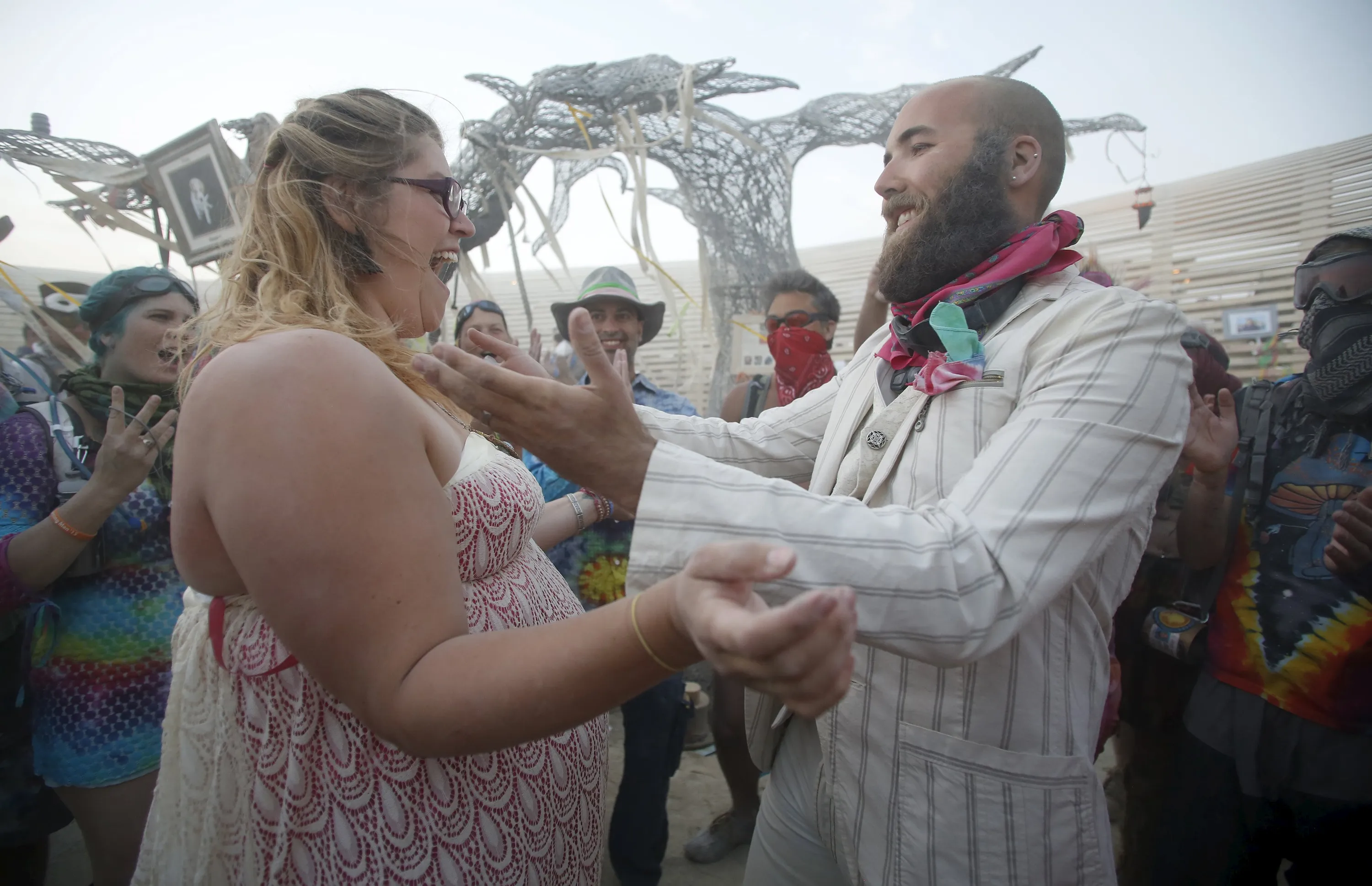 Shandi Trolson (L) and Jordan Lenaburg celebrate as they are married during a wedding ceremony at the Burning Man 2015 “Carnival of Mirrors” arts and music festival in the Black Rock Desert of Nevada, September 2, 2015. (Photo by Jim Urquhart/Reuters)